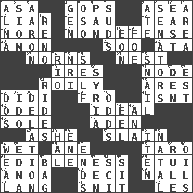 ACROSS 1. White ___ sheet 4. Republicans 8. At sea 12. One who doesn't tell the truth 14. He sold his birthright 15. Pull apart 16. Greater amount 17. Unrelated to defense, as in spending 20. Soon (poet.) 21. "Barney Miller" actor Jack 22. "One Day ___ Time" 23. Typical standards 27. A home for chicks 29. Angers 31. Connecting point 34. Agitated, as a liquid 35. Ancient Greek god of war 36. "You Light Up My Life" star Conn 39. From 41. Is not 42. Wrote a lyric poem 43. Standard of perfection 46. Not divided or shared with others 47. An important port of Yemen 48. American tennis player Robert 51. Killed 54. Dripping 56. One (Scot) 58. Edible starchy tuberous root 61. The property of being fit to eat 66. Needle holder 67. Small Philippine buffalo 68. Tenth: prefix 69. Shopping center 70. Long (Scottish) 71. In a ____ (agitated or irritated) 72. French article DOWN 1. _ mater 2. The Jewish people; Israel 3. Composer Copland 4. Commissioned mil. rank 5. Bear (Spanish) 6. Baking dish 7. Beer foam 8. Had dinner 9. Elected representatives 10. Compass direction 11. Type of rug 13. Former U.S. Attorney General Janet 18. A really long time 19. Enemy 24. _ de Janeiro 25. Medical imaging device (abbr.) 26. Automatically 28. Slow-paced one 30. Damascus' land 32. Lair 33. Eastern Standard Time (abbr.) 34. Amusement-park features 36. Two (Sp.) 37. Wedding promise 38. Conveyance 40. Likelihood 44. Snakelike fish 45. Santa ___, CA 49. Actor Linden 50. Compass dir. 52. A distinct part 53. Relating to or accompanying birth 54. Welt 55. Pulitzer Prize-winning author Ferber 57. Extremities 59. General guideline 60. Petroleums 62. Paper or plastic container 63. Car or cant ending 64. _-fi 65. Be seated