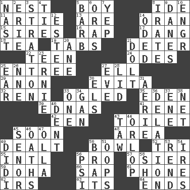 ACROSS 1. Egg locale 5. Male child 8. Binary compound 11. Nick name for Arthur 13. "We ___ not amused" (Victoria) 14. NW Algerian seaport 15. Titles for men of rank and authority 16. Hit sharply and swiftly 17. Mild oath, euphamism for damn 18. Beverage made from leaves 19. Bar bills 21. Prevent from occurring 22. Adolescent 24. Lyric poems 25. Main course 27. Pipe bend 29. Soon (poet.) 30. Webber/Rice musical 32. Painter Guido (1575-1642) 33. Stared at amorously 35. Genesis locale 39. Ferber et al. 41. French philosopher Descartes 42. Car or cant ending 43. Rest room 45. Within a short period 48. Type of rug 49. Started a card game 50. Soup holder 52. Three (prefix) 55. International (abbr.) 56. Adept person 57. Flexible twig of a willow tree 59. Capital of the state of Qatar 60. Plant excrement 61. Give a jingle 62. Big collection agency 63. It is 64. Extremities DOWN 1. Political cartoonist Thomas 2. 4th largest of the Great Lakes 3. Ski resort town in Vermont 4. Make a knot 5. Sharp remark 6. Mouths or openings 7. Slangy assent 8. Feeling or showing extreme anger 9. Natives or inhabitants of Denmark 10. Engineer (abbr.) 12. First name in cosmetics 14. Wrote a lyric poem 20. A saturated hydrocarbon 21. Dunce 23. Bert's buddy 25. Ewer handle 26. Compass dir. 27. Night before a holiday 28. Flaplike covering 30. Raised railways 31. Nest on high 33. Single 34. Separate the seeds from cotton 36. Accusation by an informer 37. Compass dir. 38. Fish or hair follower 40. Undesirable depression on a surface 43. The 23rd letter of the Hebrew alphabet 44. Fourth or lowest deck 45. Sir (Sp.) 46. Curses 47. Rounded earthenware pot or jar 49. "You Light Up My Life" star Conn 50. Naughty child 51. I made a mistake 53. Tear apart 54. Angers 56. 23rd letter of the Greek alphabet 58. A female animal or person