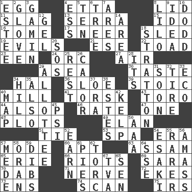 ACROSS 1. Ovum 4. Singer James 8. Hat (slang) 11. Volcanic refuse 13. Father Junipero _ 15. Wedding promise 16. Heavy book 17. Scornful expression 18. Downhill vehicle 19. Vices 21. Compass dir. 22. Frog relative 23. Car or cant ending 24. The grampus (Milton) 27. Wind 29. At sea 30. Clothes sense 34. Actor Linden 36. _ gin 39. Unemotional 40. Place where flour is made 41. Cod relative 43. "Corrida" creature 44. Columnist Joseph or Stewart 46. Pace 47. Single 48. Ground plans 49. Flair 51. Standoff 53. Health resort 54. Epoch 57. Method 60. Fitting 63. Indian state 65. One of the Great Lakes 66. Debaucheries 69. "Two Mules for Sister ____" 70. Pat or tap gently 71. Boldness 72. Supplements with great effort 73. Followers of ems 74. Glance over 75. Big collection agency DOWN 1. First name in cosmetics 2. Michael Jackson trademark 3. Homeless child 4. Curvy letter 5. "___ Little Indians" 6. Woody plant 7. Ancient Greek god of war 8. _ and Stitch 9. It may be bright or harebrained 10. Texas town _ City 12. Set 14. Type of rug 18. Ski resort town in Vermont 20. Mayday 25. Take ten 26. Bodily heat indicating an inflammation 28. ___ a Wonderful Life 29. One to whom something is allotted 31. Within a short period 32. Become fatigued 33. Environmental prefix 34. Land elevation 35. In addition 37. Mouth or opening 38. _____ Park, CO 40. Atlas unit 42. Seaweed 45. 23rd letter of the Greek alphabet 50. American Automobile Association (abbr.) 52. Merit 54. 1973 Nobel Price Winner (Physics) Leo 55. More uncommon 56. Collect or gather 57. Ancient Persian 58. Northwest Algerian city 59. Rights 61. Sliced desserts 62. Torque (variant) 64. Compass dir. 67. Federal power corp. 68. Elected rep.