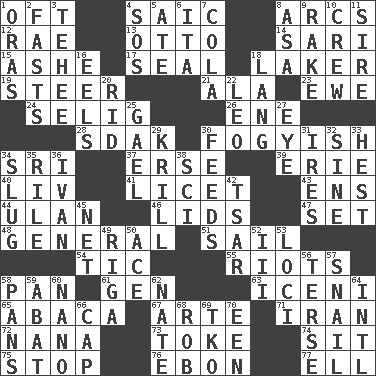 ACROSS 1. Often (poetically) 4. Ketch in the Levant 8. Arches 12. Actress Charlotte 13. Von Bismarck 14. Indian skirt 15. American tennis player Robert 17. Lick closed 18. Member of a famous L.A. basketball team 19. Navigate 21. Chicken ___ king 23. She-sheep 24. Former Milwaukee Brewers owner Bud 26. Compass dir. 28. Neighbor of Neb. 30. Out of fashion; old fashioned 34. _ Lanka 37. Celtic language 39. 4th largest of the Great Lakes 40. 54 in ancient Rome 41. It is permitted: Lat. 43. Followers of ems 44. ____ Bator 46. Flaplike coverings 47. Put into a specified state 48. Commissioned military rank 51. Travel by water 54. Nervous spasm 55. Disturbances 58. Baking dish 61. Commissioned mil. rank 63. Ancient Celtic tribe of eastern Britain 65. Phillipine bananalike plant 67. Johnson of "Laugh-In" 71. SW Asia republic 72. Nanny 73. Casino tip 74. Be seated 75. Obstruct or block passage 76. Inky black, to poets 77. Pipe bend DOWN 1. Mouths or openings 2. Goes without food and/or water 3. Giggle 4. Mayday 5. Had dinner 6. Call ___ day 7. Root beer relative 8. White ___ sheet 9. Immoral or dissolute person 10. Group working together 11. Beget 16. Snakelike fish 18. Long (Scottish) 20. To free from 22. Lion 25. Highlander 27. Sight organ 29. Shrimp-like planktonic crustaceans 30. Gives food to 31. Angers 32. Trig term 33. Behest 34. A hard, heavy blow 35. Cause heat under the collar 36. "Terrible" tsar 38. _-fi 42. Russian ruler of old 45. Remaining after all deductions 49. Port city in Latvia 50. Adept person 52. One more than two 53. Venues 56. Laconic 57. Slow-paced one 58. Baking dishes 59. Blind as ____ 60. Billionth: prefix 62. Nathan's nickname 64. International (abbr.) 66. Head covering 68. Director Reiner 69. Ring climax 70. Car or cant ending