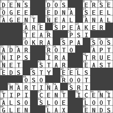 ACROSS 1. Hiding places for outlaws 5. Two (Sp.) 8. Celtic language 12. Double curve, resembling the letter S 13. Pulitzer Prize-winning author Ferber 15. Stitch closed the eyes of (a falcon) 16. Rep 18. Be tempered by heat 19. Of or related to the anus 20. "We ___ not amused" (Victoria) 22. Orator 24. Lacerate 26. Air pressure measure (abbr.) 27. Gumbo ingredient 28. Health resort 29. Mayday 32. The sixth month of the Jewish calendar 35. Printing process, for short 37. Fitting 38. Cuts off 39. Lyricist Gershwin 40. Loyal 41. Fish or hair follower 42. Play the lead 43. 90 degrees 44. Begley and Asner 45. Filthy place 46. Snakelike fish 49. Bear (Spanish) 50. Carrot, for example 51. Chrissie's court nemesis 55. _ Lanka 56. Native american tent (variation) 57. Penny 59. Ancient Celtic tribe of eastern Britain 63. In addition 64. _ gin 65. Plunder 66. Small, secluded valley 67. Not strict 68. Extremities DOWN 1. ___ good deed 2. Ovum 3. Born 4. Elected representatives 5. Lair 6. Lyric poems 7. Fastener 8. 1973 Nobel Price Winner (Physics) Leo 9. French philosopher Descartes 10. Burn superficially 11. Pipe bend 14. City in Syria 17. Long journey 21. Hearing organ 23. White ___ sheet 25. Noteworthy scarcity 28. A viewer who gazes fixedly 29. "Two Mules for Sister ____" 30. Musical composition 31. Proofreading order 32. Singer Murray 33. Passed on 34. Tenement units (abbr.) 36. Mouth or opening 40. A testis 42. Unemotional ones 45. Fast jet (abbr.) 47. Greek goddess of the dawn 48. Australian parrot (variant) 49. Greek mythologigal hunter 51. Place where flour is made 52. Domed church section 53. 1994 drama film starring Jodie Foster 54. Small Philippine buffalo 56. Label 58. John Ritter's dad 60. A really long time 61. Dreamland 62. It is
