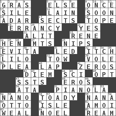ACROSS 1. Pate de foie ____ 5. Otherwise 9. Single time 13. Drop; flow; fall 14. (Had) reclined 15. Within a short period 16. The sixth month of the Jewish calendar 17. Religious groups 18. Drink excessively 19. The state or an instance of erring 21. Affirmative reply 22. Came down and settled, as after flight 23. French philosopher Descartes 24. Layer 27. Mountains (abbr.) 28. Cuts off 29. Webber/Rice musical 31. Directed 32. Hankering 36. _ and Stitch 37. Pull behind 38. Short-tailed, large-bodied rat 39. Entreaty 40. Infant locale 41. Nothings 42. South Vietnam president (1954) 44. _-fi 46. Choose 47. Fast planes 48. Greek god of love 50. "One Day ___ Time" 51. Player piano 54. Billionth: prefix 56. Sycophant 58. Grandmother 60. "Beetle Bailey" pooch 61. Capri or Wight 62. Mine, in Marseilles 63. Welt 64. Christmas carol 65. 480, 500 or 516 sheets of paper DOWN 1. Girls' org. (abbr.) 2. Travel on an animal 3. Having or resembling wings 4. Father Junipero _ 5. Chooses 6. Made of lace 7. Be seated 8. Followers of ems 9. Clearly or manifestly demonstrative 10. Trap for birds or small mammals 11. Police officer (slang) 12. Compass dir. 17. In a ____ (agitated or irritated) 20. _ mater 21. Slangy assent 23. To free from 24. Assist 25. Morally bad or wrong 26. "Death on the ____" 28. ___ Haven, CT 30. Inedible or poisonous agaric 31. Chop off 33. "Corrida" creature 34. Hoof sound 35. Behest 37. Scottish cap 40. French article 41. The Jewish people; Israel 43. Call ___ day 44. A glass for beer 45. Supercomputer manufacturer 47. Before Barbara or Clara 49. Underwater navigation system 51. Diluted with white 52. Unable to walk 53. Small Philippine buffalo 54. At this time 55. Had dinner 56. Shallow baking pan 57. Bear (Spanish) 59. Direct toward a target or goal