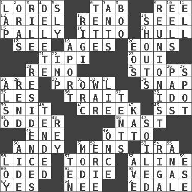 ACROSS 1. Domineers 6. Bar bill 9. Portuguese money of account (variant) 12. Satellite of Uranus 13. Western Nevada city 14. Stitch closed the eyes of (a falcon) 15. Friendly 16. "Tell ____ the Marines!" 17. Frame or body of a ship 18. Perceive with the eye 19. Eons 20. Immeasurably long periods of time 21. Native american tent (variation) 23. Fr. "Yes" 24. San ____ (Riviera town) 25. Constricts 28. "We ___ not amused" (Victoria) 30. Move like a hungry wolf 34. Fastener 35. French article 36. Distinguishing feature 38. Wedding promise 39. In a ____ (agitated or irritated) 41. Small stream 43. Fast jet (abbr.) 44. More peculiar 46. Political cartoonist Thomas 48. Compass dir. 49. "Beetle Bailey" pooch 50. Actor Griffith 51. Not women's 53. Lyricist Gershwin 56. Louse (plural) 57. Torque (variant) 58. Place in a line 60. Wrote a lyric poem 61. Singer Brickell 62. Viva Las _ 63. It is so 64. Born 65. Peak District village in England DOWN 1. Pet locale 2. Mouths or openings 3. Cause heat under the collar 4. Erase 5. Mischievous 6. False hair 7. Pismires 8. Sometimes accompanies a hiss 9. One who advocates reunion 10. Snakelike fish 11. Pipe bend 13. Swiss mountan, "Queen of the Mountains" 14. Yells 19. To the left, to Queeg 20. Greek goddess of the dawn 22. Naughty child 24. Dwellings 26. Groovy apts. 27. Blemish 28. In addition 29. Tear apart 31. The grampus (Milton) 32. Armed conflict 33. Whopper 37. Portable shelters 40. Looked after 42. Krazy ___ of comics 45. Marina Del _, California 47. Dirtied 49. Single time 50. Assistant 51. Method 52. 4th largest of the Great Lakes 54. Port city in Latvia 55. Of or related to the anus 56. Myrna of the movies 57. "___ Little Indians" 58. "___ Maria" 59. Compass dir.