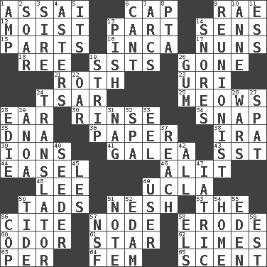 ACROSS 1. Slender Brazilian palm 6. Head covering 9. Actress Charlotte 12. Damp 13. Component 14. Elected reps. 15. Components 16. South American Indian 17. Religious women 18. To separate or throw off 19. Fast planes 20. Went 21. Writer of Portnoy's Complaint (1969) 23. RI univ. 24. Russian ruler of old 25. Catcalls? 28. Ewer handle 30. Wash lightly 34. Fastener 35. Heredity factor (abbr.) 36. Some stationery 38. Retirement account (abbr.) 39. Charged atoms 41. An organ shaped like a helmet 43. Fast jet (abbr.) 44. Artist's stand 46. Came down and settled, as after flight 48. Area sheltered from the wind 49. Southern CA. univ. 50. Bits 51. Delicate 53. Definite Article 56. Quote 57. Connecting point 58. Wear away 60. Aroma 61. Play the lead 62. Citrus fruits 63. For each 64. Opposite of masc. 65. Aroma DOWN 1. Electrical Unit 2. Fly high 3. The founder of a family 4. Michaelmas daisies 5. ___ a Wonderful Life 6. Patter 7. Curves 8. Parent Teacher Association (abbr.) 9. One who advocates reunion 10. Queen of England 1702-14 11. Curvy letter 13. Expression of disdain 14. Sounds asleep 19. Remove all contents or possession from 20. Chewing product 22. Boat paddle 24. Interpreter 26. Armed conflicts 27. Petty quarrel 28. Singer Brickell 29. Small Philippine buffalo 31. Tired old horse 32. Health resort 33. Snakelike fish 37. Arrive at 40. Sowing specialist 42. Everything 45. French article 47. Of or pertaining to medicine 49. One who uses or employs something 50. Event that recurs at intervals 51. Observe 52. Dutch treat 54. Dwelling 55. Genesis locale 56. Police officer (slang) 57. Overdraft (abbr.) 58. Raised railways 59. Eastern Standard Time (abbr.)