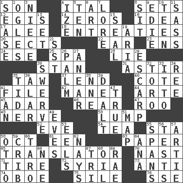 ACROSS 1. Male child 4. Slanted text style (abbr.) 8. Arranges properly for use 12. Armor plate that protects the chest 14. Nothings 16. It may be bright or harebrained 17. Toward shelter 18. Pleas 20. Religious groups 22. Ewer handle 23. Followers of ems 24. Compass dir. 25. Health resort 28. Untruth 30. Comedian Laurel of Laurel & Hardy 31. Being in motion 35. The 23rd letter of the Hebrew alphabet 37. Grant temporary use of 40. ____ d'Azur (French Riviera) 41. Do some clerical work 42. French painter Edouard 44. Johnson of "Laugh-In" 45. The sixth month of the Jewish calendar 46. Hitchcock's "____ Window" 47. Friend of Pooh 48. Boldness 50. Mass 52. Night before a holiday 54. Afternoon social gathering 55. R.R. building 58. Sep. follower 61. Car or cant ending 63. Some stationery 65. Interpreter 70. Political cartoonist Thomas 71. Become fatigued 72. Damascus' land 73. Against 74. Mitch Miller's instrument 75. Filth; sediment 76. Compass dir. DOWN 1. Gospel singer Marvin 2. Stares at amorously 3. Sibling's daughter 4. Ending with capital 5. "___ Little Indians" 6. Nonscientific branch of learning 7. Old wives' tales, e.g. 8. Be seated 9. Singer Brickell 10. Adolescent 11. Backtalk 13. Arrange properly for use 15. Lick closed 19. Roberta Peters solo 21. Fast jet (abbr.) 26. Inside of hand 27. Approach 29. Fortification 30. Turn aside suddenly 32. "Corrida" creature 33. "Tell ____ the Marines!" 34. Portuguese money of account (variant) 35. Periodic rise and fall of the sea level 36. Having or resembling wings 38. Compass dir. 39. Started a card game 41. Air blower 43. Loyal 49. Nights before holidays 51. Atlas unit 53. Snakelike fish 55. Connects, as a bridge 56. Trials 57. Nick name for Arthur 58. Von Bismarck 59. Baby bed with high sides 60. Pacific island yam 62. Negative votes 64. Santa ___, CA 66. Born 67. Three (prefix) 68. Lubricate 69. Actress Charlotte