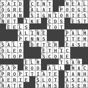 ACROSS 1. Expressed in words 5. Penny 9. Actress Patricia 13. Legendary monster 14. Jai _ 15. Porridge 16. Northwest Algerian city 17. Seigniories (variant) 19. Remaining after all deductions 20. Mamie's husband 21. Music discs 22. Eastern Standard Time (abbr.) 23. Snakelike fish 25. Small child 26. Place in a line 30. Inside of hand 34. Actor Sean's family 35. A whole individual unit 36. Table seasoning 39. Prevent from occurring 42. Relaxation 43. Margarine 44. Moral principle 46. Halt 47. Biscuitlike quick bread 48. Shade tree 51. Russian ruler of old 54. Plant excrement 57. Friend of Pooh 58. 100% 60. Big _ 62. Appease 65. Hyperbolic tangent 66. Nest on high 67. Narrow, elongated depression 68. At sea 69. Pace 70. Scottish caps 71. One who makes use of a thing DOWN 1. Within a short period 2. Match 3. Feeling or showing extreme anger 4. Lair 5. Keg 6. Writer Wiesel 7. Tired old horse 8. Colored lightly or faintly 9. Not either 10. Singer Brickell 11. Eras 12. For fear that 15. Mail 18. Wedding promise 20. Small island 24. Portable computer 27. Indiana (abbr.) 28. Compass dir. 29. _____ Park, CO 30. Components 31. "One Day ___ Time" 32. French article 33. Madame (abbr.) 36. Mayday 37. Keyboard modifier key 38. Lion 40. And so on (abbr.) 41. 17th letter of the Greek alphabet 45. International (abbr.) 48. 4th largest of the Great Lakes 49. Car dealer's back yard 50. Damp 52. Collect or gather 53. The wife of a rajah (variant) 54. Coast Guard woman 55. Length times width 56. Left side of a ship or aircraft 58. Tiny particle 59. Allows 61. Burn to charcoal 63. Sliced dessert 64. Insect wing 65. The 19th letter of the Greek alphabet
