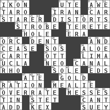 ACROSS 1. Picture 5. Shoshoni 8. Deep reverence 11. Pacific island yam 12. SW Asia republic 13. 4-wheeled motor vehicle 14. A viewer who gazes fixedly 17. What propaganda does 19. Disco prop 21. Cigar-shaped 22. Opening into or through something 23. Epoch 24. The grampus (Milton) 27. Gouge 29. Also 32. Stop 34. Distress signal 36. _ vera 37. Haul 38. Baseball player Mel 39. Pale green bean 40. Southern CA. univ. 41. Modern: prefix 42. Lessep's creation 43. 17th letter of the Greek alphabet 44. Not divided or shared with others 46. Begley and Asner 47. Had dinner 50. Gilt 52. Food allowance for one day 55. Ear of corn 57. Make much ado about nothing 59. Makes clutter 62. Shallow baking pan 63. Proofreading order 64. Patter 65. Increase 66. A weed 67. Chop _ DOWN 1. It is 2. Krazy ___ of comics 3. Mouths or openings 4. Compass direction 5. RI univ. 6. Clothes sense 7. Keyboard key 8. 43,560 square feet 9. Electrical Unit 10. Celtic language 12. Binary compound 15. Eat (away) 16. Hero or heavy, e.g. 18. Mouth or opening 20. Gillaume's butler role 24. Come to pass 25. Arrive at 26. Monte _, Las Vegas Hotel/Casino 28. Hauls 29. Place in a line 30. Wanderer 31. Allots cards 33. R.R. building 35. Moe Howard, for one 36. Wing 42. Cell (Danish) 45. Rich soil 47. Wind 48. Cod relative 49. Maternal 51. Plates 52. Round or rotation of duties 53. Enthusiastic 54. Be inclined (to) 55. Was introduced to 56. He sold his birthright 58. John Ritter's dad 60. Compass dir. 61. Filthy place