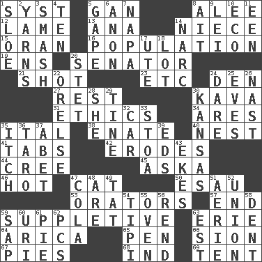 ACROSS 1. System (abbr.) 5. Separate the seeds from cotton 8. Toward shelter 12. Unable to walk 13. Santa ___, CA 14. Sibling's daughter 15. Northwest Algerian city 16. Census information 19. Followers of ems 20. Elected representative 21. Guess 23. And so on (abbr.) 24. Lair 27. Repose 30. Polynesian shrub of the pepper family 31. Value system 34. Ancient Greek god of war 35. Slanted text style (abbr.) 38. Maternal 40. A home for chicks 41. Bar bills 42. Eats (away) 44. Algonquian 45. "____ silly question..." 46. Being at a high temperature 47. Feline 50. Son of Isaac 53. Speakers 57. Conclusion 59. Supplying deficiencies 63. One of the Great Lakes 64. N. Chile seaport 65. Animal enclosure 66. The Jewish people; Israel 67. Sliced desserts 68. Working for oneself (abbr.) 69. Portable shelter DOWN 1. _ gin 2. Tall tales 3. Box-office sellout 4. Nine, plus one 5. Stare wonderingly 6. Soon (poet.) 7. California wine valley 8. Small island 9. Flowery wreath 10. Environmental prefix 11. Car or cant ending 14. Drug cop 17. Shoshoni 18. Car dealer's back yard 20. Proofreading order 22. Threatening words 24. Have the gumption 25. Nights before holidays 26. Political cartoonist Thomas 28. A female animal or person 29. Prong on a fork 30. Sunflower state 32. Auto 33. Portico 35. Hankering 36. Pacific island yam 37. Collude with 39. Begley and Asner 43. Supplements with great effort 47. Root beer relative 48. "We ___ not amused" (Victoria) 49. Make lace 51. Nest on high 52. The state of being joined or united 54. Native american tent (variation) 55. Baking chamber 56. Tear apart 58. Undesirable depression on a surface 59. Plant excrement 60. RI univ. 61. Sliced dessert 62. Personal Computers (abbr.) 63. Eastern Standard Time (abbr.)
