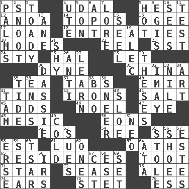 ACROSS 1. Pacific Standard Time (abbr.) 4. Hereditary estate 8. Command 12. Small Philippine buffalo 14. Traditional theme or motif 16. Double curve, resembling the letter S 17. Grant temporary use of 18. Pleas 20. Methods 22. Snakelike fish 23. Fast jet (abbr.) 24. Filthy place 25. Actor Linden 28. Allow 30. Centimeter-gram-second unit of force 31. Large country 35. Beverage made from leaves 37. Bar bills 40. Arab leader 41. Canisters 42. Removes the wrinkles 44. Table seasoning 45. Sums up 46. Christmas carol 47. Sight organ 48. Mesonic 50. Immeasurably long periods of time 52. Greek goddess of the dawn 54. To riddle 55. Compass dir. 58. Eastern Standard Time (abbr.) 61. Nilotic language 63. Profane or obscene expressions 65. Homes 70. A blast of a horn 71. Play the lead 72. Gospel singer Marvin 73. Toward shelter 74. Hearing organs 75. Proofreading order 76. Curvy letter DOWN 1. Insides of hands 2. Snob 3. Sycophant 4. Shoshoni 5. Spanish title 6. Fitting 7. Old wives' tales, e.g. 8. Being at a high temperature 9. Armor plate that protects the chest 10. Observes 11. Trial 13. A saturated hydrocarbon 15. Sew up the eyelids of hawks and falcons 19. Actor Baldwin 21. Like a shrinking violet 26. Opposed to 27. Memorize 29. College papers 30. Small ungulate mammals of Africa 32. "If ____ say so..." 33. The longest river in the world 34. Tate display 35. Periodic rise and fall of the sea level 36. Extremities 38. Oct. 31 cry 39. Scornful expression 41. Scottish cap 43. A type of plum 49. Chilled 51. Modern: prefix 53. Institutes legal proceedings 55. Fur scarf 56. Imelda's hoard 57. _____ Park, CO 58. Celtic language 59. Stalk of a moss capsule 60. Russian ruler of old 62. Washington bills 64. "One Day ___ Time" 66. Big collection agency 67. Domesticated feline 68. Compass dir. 69. Put into a specified state