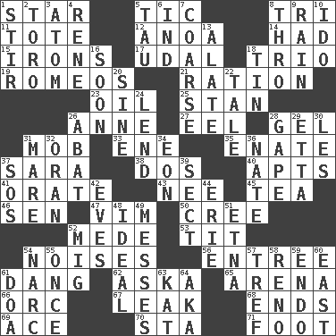ACROSS 1. Play the lead 5. Nervous spasm 8. Three (prefix) 11. Carryall 12. Small Philippine buffalo 14. Possessed 15. Removes the wrinkles 17. Freehold land 18. Musical group of three 19. Lover boys 21. Food allowance for one day 23. Lubricate 25. Comedian Laurel of Laurel & Hardy 26. Singer Murray 27. Snakelike fish 28. Set 31. Crowd into 33. Compass dir. 35. Maternal 37. "Two Mules for Sister ____" 38. Two (Sp.) 40. Flats, for short 41. Declaim 43. Born 45. Beverage made from leaves 46. Elected rep. 47. Zeal 50. Algonquian 52. Ancient Persian 53. Teat (slang) 54. Annoying sounds 56. Main course 61. Mild oath, euphamism for damn 62. "____ silly question..." 65. Sports stadium 66. The grampus (Milton) 67. Path through which fluid escapes 68. Conclusions 69. Adept person 70. R.R. building 71. 12 inches DOWN 1. Use a swizzle stick 2. "Corrida" creature 3. Tiny particle 4. French philosopher Descartes 5. The 19th letter of the Greek alphabet 6. Working for oneself (abbr.) 7. Unrefined 8. Through, poetically 9. Water falling in drops from the sky 10. Wedding promise 13. Having winglike extensions 16. Within a short period 18. Metal container 20. Trig term 22. Falsehood 24. Grant temporary use of 26. Blind as ____ 28. Open wide 29. Singer James 30. French article 31. Female horse 32. Northwest Algerian city 34. A really long time 36. Nathan's nickname 37. Mayday 39. Religious group 42. Nights before holidays 44. One of the Great Lakes 48. Standard of perfection 49. Makes clutter 51. Inactive volcano in Sicily 52. Russian fighter aircraft 54. Drug cop 55. Single time 57. Unclean, religiously 58. Former U.S. Attorney General Janet 59. Inside; within (prefix) 60. 90 degrees 61. ___ good deed 63. Krazy ___ of comics 64. Alias (abbr.)