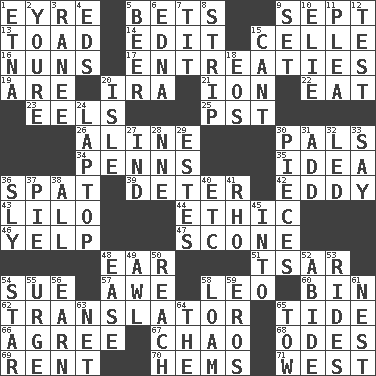 ACROSS 1. Jane of fiction 5. Wagers 9. Back-to-school mo. 13. Frog relative 14. Prepare for publication 15. Cell (Danish) 16. Religious women 17. Pleas 19. "We ___ not amused" (Victoria) 20. Lyricist Gershwin 21. Electrically charged atom 22. Consume 23. Snakelike fish 25. Pacific Standard Time (abbr.) 26. Place in a line 30. Friends 34. Actor Sean's family 35. The content of cognition 36. Argument over a trivial matter 39. Prevent from occurring 42. Whirlpool 43. _ and Stitch 44. Value system 46. Sharp bark 47. Biscuitlike quick bread 48. Ewer handle 51. Russian ruler of old 54. Take to court 57. Deep reverence 58. Lion 60. Storage container 62. Interpreter 65. Periodic rise and fall of the sea level 66. Match 67. US Secretary of Labor Elaine L. _ 68. Lyric poems 69. Monthly bill 70. Equivocates 71. 270 degrees DOWN 1. Inactive volcano in Sicily 2. You are 3. Indian princess (variant) 4. Begley and Asner 5. Fermented drink made from hops 6. Pulitzer Prize-winning author Ferber 7. Teat (slang) 8. Empty completely 9. Arrange properly for use 10. Writer Wiesel 11. Entreaty 12. Trial 15. Patter 18. Greek goddess of the dawn 20. Small island 24. Portable computer 27. Working for oneself (abbr.) 28. Compass dir. 29. _____ Park, CO 30. Parts 31. Increase 32. Directed 33. Declare 36. Wily 37. Sliced dessert 38. Everything 40. And so on (abbr.) 41. 17th letter of the Greek alphabet 45. To the inside or interior of 48. Comfort 49. Leather borer 50. Arrive at 52. Tolerate 53. Amusement-park features 54. Play the lead 55. Goad 56. Merit 58. Rich soil 59. Greek god of love 61. A home for chicks 63. Fish or hair follower 64. Definite Article 65. Pull behind