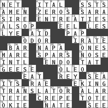 ACROSS 1. Remaining after all deductions 4. Slanted text style (abbr.) 8. Fast planes 12. So be it 14. Nothings 16. "Two Mules for Sister ____" 17. Title for a man of rank and authority 18. Pleas 20. Columnist Joseph or Stewart 22. Snakelike fish 23. French article 24. Potassium hydroxide 25. Help 28. Infant food 30. Aroma 31. Feeling or showing extreme anger 35. Tavern 37. California wine valley 40. Washington bills 41. Female horse 42. Practice fights 44. Characteristic smell of wine 45. International (abbr.) 46. Inside; within (prefix) 47. Make lace 48. Honkers 50. Margarine 52. Ingest 54. Marina Del _, California 55. Ocean 58. ___ a Wonderful Life 61. Actress Charlotte 63. Supplementing with great effort 65. Interpreter 70. Having or resembling wings 71. False hair 72. Streamer paper 73. Haul 74. Migrant worker of the '30s 75. Nathan's nickname 76. Perceive with the eye DOWN 1. Rhinal 2. Poet Dickinson 3. Laconic 4. Ending with capital 5. "___ Little Indians" 6. Tate display 7. Old wives' tales, e.g. 8. Fast jet (abbr.) 9. Move on water 10. Family _ (genealogy) 11. Backtalk 13. Modern: prefix 15. Ooze 19. Mountain range southwest of Kyrgyzstan 21. Groovy apt. 26. Charged particles 27. Window treatment 29. Right away 30. Threatening words 32. Small Philippine buffalo 33. Trial 34. Compass dir. 35. Object of repulsion 36. Johnson of "Laugh-In" 38. Baking dish 39. Zeal 41. Russian fighter aircraft 43. Flatfish 49. Hearing organs 51. Sight organ 53. Baby powder 55. Grain storage towers 56. Related on the mother's side 57. Match 58. "Tell ____ the Marines!" 59. Long journey 60. Suttee (variant) 62. Merit 64. Krazy ___ of comics 66. Born 67. Afternoon social gathering 68. Choose 69. To sift