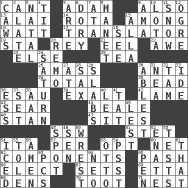 ACROSS 1. Patter 5. First of billions? 9. In addition 13. Jai ____ 14. Round or rotation of duties 15. Amid 16. Electrical Unit 17. Interpreter 19. R.R. building 20. Marina Del _, California 21. Snakelike fish 22. Deep reverence 23. Otherwise 25. Afternoon social gathering 26. Collect or gather 30. Opposed to 34. Add up to 35. Necklace unit 36. He sold his birthright 39. Glorify 42. Unable to walk 43. Shrivel 44. Calif. Air Force Base 46. Comedian Laurel of Laurel & Hardy 47. Settings 48. Compass dir. 51. Proofreading order 54. Call ___ day 57. For each 58. Choose 60. Fish or hair follower 62. Pieces 65. Romantic infatuation 66. Choose 67. Puts into a specified state 68. Singer James 69. Lairs 70. A blast of a horn 71. A home for chicks DOWN 1. Crow sounds 2. Having winglike extensions 3. Relating to or accompanying birth 4. Teat (slang) 5. Johnson of "Laugh-In" 6. Rowboat 7. "One Day ___ Time" 8. French painter Edouard 9. Housemaid (var.) 10. Globular water bottle used in Asia 11. Frozen precipitation 12. Legendary monster 15. Silent film actress Nazimova 18. Perceive with the eye 20. San ____ (Riviera town) 24. Titan orbits this 27. Had dinner 28. Saxophone 29. Thick slices 30. Most capable 31. Teachers' org. 32. Scottish cap 33. Binary compound 36. Curvy letter 37. Arrange properly for use 38. American Automobile Association (abbr.) 40. Luau accessory 41. Make lace 45. For fear that 48. Specific locale 49. Elected rep. 50. Take or capture by force 52. Related on the mother's side 53. Trials 54. On the rocks 55. Lacquered or enameled metalware 56. So be it 58. "Beetle Bailey" pooch 59. Inconspicuous attention getter 61. Not this but _ 63. Personal Computers (abbr.) 64. Modern: prefix 65. Animal enclosure