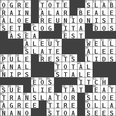 ACROSS 1. Legendary monster 5. Lug 9. Thick slice 13. Precipitation 14. Having or resembling wings 15. Calif. Air Force Base 16. Medicinal plant 17. One who advocates reunion 19. Put into a specified state 20. Gear tooth 21. Call ___ day 22. Two (Sp.) 23. At sea 25. Eastern Standard Time (abbr.) 26. Eskimo relative 30. Water source 34. Chalkboard 35. Toward shelter 36. Whine 39. Musical pauses 42. Hats (slang) 43. Of or related to the anus 44. "_____ Recall" 46. Pinches, bites 47. Showing deterioration from age 48. Greek goddess of the dawn 51. Hankering 54. Institute legal proceedings 57. Untruth 58. Make lace 60. Erode 62. Interpreter 65. A type of plum 66. Match 67. Hoop that covers a wheel 68. Rounded earthenware pot or jar 69. Billionth: prefix 70. Portico 71. Observes DOWN 1. Mouths or openings 2. An organ shaped like a helmet 3. Disturbances 4. Compass dir. 5. Edible starchy tuberous root 6. Cassini of fashion 7. The 19th letter of the Greek alphabet 8. Bert's buddy 9. Elected rep. 10. Put down 11. In addition 12. Stakes 15. Water vessel 18. It is 20. Give a ring to 24. Artist's stands 27. Ewer handle 28. Shoshoni 29. Trials 30. Place for singles 31. Biblical high priest 32. Directed 33. French article 36. Baking dish 37. Single; one (prefix) 38. Infant locale 40. Small child 41. R.R. building 45. Came down and settled, as after flight 48. Otherwise 49. Petroleum 50. Theater features 52. Cell (Danish) 53. White Person, in Hawaii 54. Comedian Laurel of Laurel & Hardy 55. Capital and largest city of Mongolia 56. Merit 58. "Corrida" creature 59. Type of rug 61. Beverages made from leaves 63. Modern: prefix 64. Teat (slang) 65. Distress signal