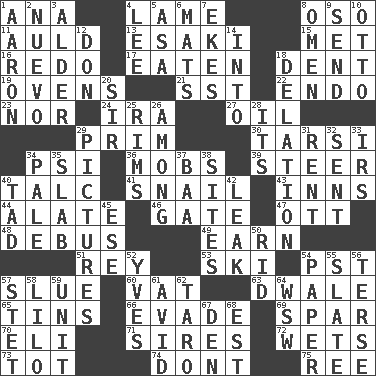 ACROSS 1. Santa ___, CA 4. Unable to walk 8. Bear (Spanish) 11. Old (Scot.) 13. 1973 Nobel Price Winner (Physics) Leo 15. Was introduced to 16. Do over again 17. Consumed 18. Gouge 19. Baking chambers 21. Fast jet (abbr.) 22. Inside; within (prefix) 23. And not 24. Lyricist Gershwin 27. Petroleum 29. Demure 30. Tarsus (plural) 34. 23rd letter of the Greek alphabet 36. Disorderly crowds 39. Bull 40. Baby powder 41. Slow-paced one 43. Taverns 44. Having winglike extensions 46. Yard entry 47. Baseball player Mel 48. Alight from a bus 49. Merit 51. Marina Del _, California 53. What Jean-Claude Killy likes to do 54. Pacific Standard Time (abbr.) 57. Turn sharply 60. Large container 63. A sleeping potion; an opiate (poet.) 65. Airtight sealed metal containers 66. Dodge 69. Practice fight 70. Biblical high priest 71. Fathers 72. Soaks 73. Small child 74. Do not 75. To riddle DOWN 1. Composer Copland 2. New (sp.) 3. Tree or shrub in the Birch family 4. Area sheltered from the wind 5. White ___ sheet 6. Floor coverings 7. Supplements with great effort 8. Sign of things to come 9. Post 10. Von Bismarck 12. Spanish title 14. To the inside or interior of 18. Conveyance 20. Title for a knight 25. Basketball hoops 26. Amid 28. It is 29. Photos 31. Monthly bill 32. Emitted 33. Big collection agency 34. Diluted with white 35. Broad, flat, thick piece 37. Sound made by sheep 38. Locates 40. Small boy 42. Path through which fluid escapes 45. Compass dir. 50. To free from 52. Jacques Cousteau's middle name 54. Some stationery 55. Chalkboard 56. Laconic 57. Proofreading order 58. _ and Stitch 59. A single undivided whole 61. Enthusiastic 62. Pacific island yam 64. Compass dir. 67. Lair 68. Eastern Standard Time (abbr.)