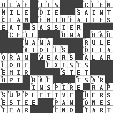 ACROSS 1. Norwegian king 5. ___ a Wonderful Life 8. Clement's nick name 12. Mediterranean tributary 13. Pass on 14. Inhabitant of Heaven 15. Dollar (slang) 16. Pleas 19. Ingest 20. More lively and spirited 21. To provide with a ceiling 23. Heredity factor (abbr.) 24. Possessed 27. Grandmother 30. Court order 31. Ringlike coral islands and reefs 34. Spanish pot 35. NW Algerian seaport 38. Erodes 40. Having or resembling wings 41. Ear part 42. Is extant 44. Independent ruler or chieftain 45. Proofreading order 46. Elect 47. Actress Charlotte 50. Russian ruler of old 53. Motivate 57. Hit sharply and swiftly 59. Supplementary 63. Possessive pronoun 64. First name in cosmetics 65. Baking dish 66. Singles 67. Pull apart 68. Conclude 69. Small pie DOWN 1. At one time in the past 2. Pale purple color 3. Having winglike extensions 4. Opposite of masc. 5. The main thing one is thinking about 6. Canisters 7. Arranges properly for use 8. Feline 9. Cards in a Roman deck? 10. Compass dir. 11. Mountains (abbr.) 14. "Two Mules for Sister ____" 17. To free from 18. Car or cant ending 20. Narrow board 22. More empty; more void 24. Frame or body of a ship 25. Silent film actress Nazimova 26. Letter starter 28. Immediately 29. Toward shelter 30. Cooks with dry heat, as in an oven 32. Not strict 33. Indian titles of respect 35. Margarine 36. Frolic 37. "This won't hurt ____!" 39. Fast jet (abbr.) 43. False hair 47. Cause heat under the collar 48. A saturated hydrocarbon 49. Eastern Standard Time (abbr.) 51. Sports stadium 52. More uncommon 54. Corncob 55. "Terrible" tsar 56. Tear apart 58. Inconspicuous attention getter 59. Arrange properly for use 60. Purpose 61. Parent Teacher Association (abbr.) 62. For each 63. Being at a high temperature