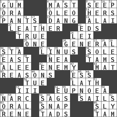 ACROSS 1. Chewing product 4. Vertical spar for supporting sails 8. Ooze 12. Mouth or opening 13. Butter sub 14. Possessive pronoun 15. Leg coverings 18. Mild oath, euphamism for damn 19. Jai ____ 20. Cordwainer's material 22. Begley and Asner 23. Loyal 24. Luau accessory 25. Single 26. Commissioned military rank 30. R.R. building 33. "_ and Lucy" (Charlie Brown theme song) 36. Flatfish 37. 90 degrees 39. Teachers' org. 40. Scottish caps 41. Toward shelter 42. Foe 44. Floor protector 45. Thinks logically 47. Double-curved letter 50. Third day of the wk. 51. Thin strip of wood or metal 53. One more than two 54. Normal relaxed breathing 57. Drug cop 59. Settles 61. Travels by water 63. Spoken 64. Fastener 65. Roguish 66. French philosopher Descartes 67. Small amounts or degrees 68. Scottish cap DOWN 1. Republican Party 2. Mountain range 3. French painter Edouard 4. Method 5. Having or resembling wings 6. Elected rep. 7. Coat; cloak 8. Most dubious of character or honesty 9. Snakelike fish 10. Epoch 11. 23rd letter of the Greek alphabet 16. Pacific island yam 17. Make senseless or dizzy 21. The bottom of a shoe or boot 22. Car or cant ending 24. French article 26. Island territory of the United States 27. Wander aimlessly 28. _ mater 29. For fear that 30. Scorch 31. Lie 32. At sea 34. Restaurants 35. Born 38. One of the two male reproductive glands 42. Compass dir. 43. Sharp bark 46. Fr. "Yes" 48. Without 49. Portico 52. Robbery 53. SW Asia republic 54. Mild oath 55. United States Postal Service (abbr.) 56. Silent film actress Nazimova 57. And not 58. "We ___ not amused" (Victoria) 59. Fast jet (abbr.) 60. Santa ___, CA 62. Symbol (abbr.)