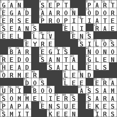 ACROSS 1. Separate the seeds from cotton 4. Back-to-school mo. 8. Role in a play 12. Mild oath 14. Composer Copland 16. Aroma 17. Celtic language 18. Conciliate 20. Actors Connery and Penn 22. Connecticut Ivy Leaguer 23. Actress Charlotte 24. Snakelike fish 25. 54 in ancient Rome 28. Followers of ems 30. Jane of fiction 31. Grain storage towers 35. Tavern 37. Armor plate that protects the chest 40. Words to Nanette 41. Redecorate 42. Before Barbara or Clara 44. Small, secluded valley 45. Froth on beer 46. Move on water 47. Raised railways 48. Channel Islands abalone 50. Grant temporary use of 52. Two (Sp.) 54. Area sheltered from the wind 55. Period 58. RI univ. 61. Surprise greeting 63. Indian state 65. Wine waiters 70. "Two Mules for Sister ____" 71. Dad 72. Take place subsequently 73. Supplements with great effort 74. Stricken, poetically 75. Peachy ____! 76. Big collection agency DOWN 1. Honkers 2. Match 3. Relating to the nose 4. Plant excrement 5. Ewer handle 6. Adept person 7. Drink excessively 8. Luau course 9. The sixth month of the Jewish calendar 10. Roll call or roster of names 11. Woody plant 13. Lair 15. Mediterranean tributary 19. Metal containers 21. Secret 26. Angers 27. Viva Las _ 29. Burned superficially 30. Worn away 32. Hang loosely or laxly 33. Washington bills 34. Boy, to dad 35. Fermented drink made from hops 36. First man 38. _ tizzy (2 wds.) 39. Not moving 41. 17th letter of the Greek alphabet 43. Toward shelter 49. Loose flowing garment 51. Teachers' org. 53. Not divided or shared with others 55. 1973 Nobel Price Winner (Physics) Leo 56. More valued for its uncommonness 57. Collect or gather 58. United States Postal Service (abbr.) 59. Wander aimlessly 60. Body of Kaffir warriors 62. Pig sound 64. Compass dir. 66. Floor protector 67. Compass dir. 68. Regret 69. Elected rep.
