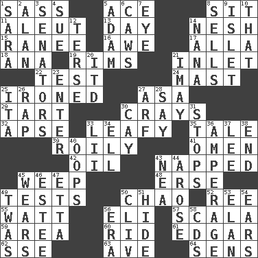 ACROSS 1. Backtalk 5. Adept person 8. Be seated 11. Eskimo relative 13. 24 hours 14. Soft 15. Indian princess (variant) 16. Deep reverence 17. Silent film actress Nazimova 18. Santa ___, CA 19. Basketball hoops 21. An arm off of a larger body of water 22. Trial 24. Vertical spar for supporting sails 25. Pressed 27. White ___ sheet 29. Small pie 30. Trading vessels 32. Domed church section 33. Like summer trees 35. Falsehood 39. Turbulent 41. Sign of something about to happen 42. Petroleum 43. Slept 45. Shed a tear 48. Celtic language 49. Trials 50. US Secretary of Labor Elaine L. _ 52. To sift 55. Electrical Unit 56. Connecticut Ivy Leaguer 57. Any of the three canals of the cochlea 59. Type of rug 60. To free from 61. _ Allan Poe 62. Compass dir. 63. "___ Maria" 64. Elected reps. DOWN 1. "Two Mules for Sister ____" 2. Actor Alda or Thicke 3. Elected representatives 4. Take to court 5. First man 6. Crow sounds 7. Sight organ 8. Makes a sale 9. Small island 10. Not this but _ 12. Laconic 14. Nanny 20. It would 21. "If ____ say so..." 23. Keyboard key 25. Call ___ day 26. Hit sharply and swiftly 27. Sandy's bark 28. Declare 30. Island 31. Ceases 33. Cards in a Roman deck? 34. Pipe bend 36. Electrical Measurement 37. Area sheltered from the wind 38. Conclusion 40. I made a mistake 43. Teachers' org. 44. Came up 45. Erodes 46. First name in cosmetics 47. Singer James 49. It was, poetically 50. 154 in Roman numerals 51. Flintstone garb 53. Enthusiasm 54. Hearing organs 56. Epoch 58. Music discs