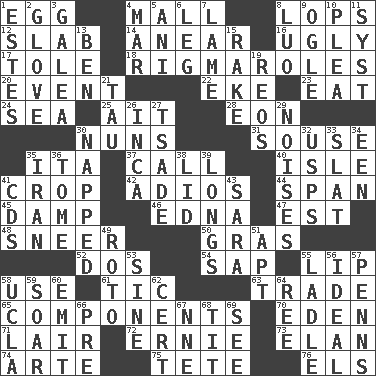 ACROSS 1. Oval reproductive body of a fowl 4. Shopping center 8. Chops off 12. Broad, flat, thick piece 14. Approach 16. Unsightly 17. Lacquered or enameled metalware 18. Complicated, petty procedures 20. Incident 22. Make supply last 23. Ingest 24. Ocean 25. Small island 28. Period of immesurable duration 30. Religious women 31. Boozer 35. Call ___ day 37. Give a ring to 40. Capri or Wight 41. Riding implement 42. Goodbye (Sp.) 44. Connect, as a bridge 45. Moist 46. Pulitzer Prize-winning author Ferber 47. Eastern Standard Time (abbr.) 48. Scornful expression 50. Pate de foie ____ 52. Two (Sp.) 54. Plant excrement 55. Mouth edge 58. Purpose 61. Nervous spasm 63. Barter 65. Parts 70. Locale of original sin 71. Den 72. Bert's buddy 73. Style 74. Johnson of "Laugh-In" 75. False hair 76. Raised railways DOWN 1. _____ Park, CO 2. Michael Jackson trademark 3. An organ shaped like a helmet 4. Third mo. 5. Black tropical American cuckoo 6. Part of a journey 7. Unable to walk 8. Nilotic language 9. Stare 10. Entreaty 11. System (abbr.) 13. Benjamin's nick name 15. Immoral or dissolute person 19. Vintage cars 21. The 19th letter of the Greek alphabet 26. South American Indian 27. Sadhe (variant) 29. Annoying sounds 30. Slept 32. United States Postal Service (abbr.) 33. Narrow board 34. Car or cant ending 35. SW Asia republic 36. Heavy book 38. Flaplike covering 39. Yearns 41. Music discs 43. "Two Mules for Sister ____" 49. Printing process, for short 51. Fitting 53. Trig term 55. Dipping utensil 56. Perfect 57. Actor Sean's family 58. Southern CA. univ. 59. Fly high 60. Send forth 62. Foregone conclusion 64. To separate or throw off 66. Before (prefix) 67. Compass dir. 68. Teat (slang) 69. Observe
