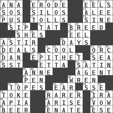 ACROSS 1. Santa ___, CA 4. Wear away 9. Snakelike fish 13. Mayday 14. Grain storage towers 15. Toward shelter 16. Product of festering 17. For Whom the Bell _____ 18. Trig term 19. Small drink 21. Make lace 22. A special lineage 24. "______ My Girl" (Turtles hit) 26. Snakelike fish 27. Moving about 29. 24-hour periods 30. Allots cards 31. Calm and collected 33. The grampus (Milton) 36. One of the 12 tribes of Israel 37. Curse 40. Ocean 41. Fast jet (abbr.) 42. Singer James 43. Smooth fabric 45. Singer Murray 47. Rep 48. Fenced enclosure 49. Songbird 50. Drinks excessively 52. Ewer handle 54. Compass dir. 56. Puff or smoke 57. More valued for its uncommonness 59. Retirement account (abbr.) 61. Capital of Western Samoa 62. Get up 63. Promise 64. Fermented drink made from hops 65. Related on the mother's side 66. Compass dir. DOWN 1. Viper 2. Horse sense 3. Aide 4. Eastern Standard Time (abbr.) 5. Disturbances 6. Rounded earthenware pot or jar 7. Stupid person 8. Double-curved letter 9. Artist's stands 10. Writer Wiesel 11. Grant temporary use of 12. Observe 20. Silvers or Donahue 22. Memphis, Tenn. Street 23. Marina Del _, California 25. Celtic language 27. Sums up 28. Oceans 29. Capital of the state of Qatar 31. Quote 32. Baseball player Mel 33. Clearly or manifestly demonstrative 34. It's straight from the horse's mouth 35. Patter 38. Actor Sean's family 39. Russian ruler of old 44. Matures 45. Seem 46. Born 49. Take or capture by force 50. Drink excessively 51. Migrant worker of the '30s 52. Merit 53. Operatic vocal solo 55. Greek god of love 56. Keyboard key 57. Actress Charlotte 58. To sift 60. Deep reverence