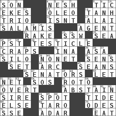 ACROSS 1. Male child 4. Tender 8. Nervous spasm 11. Supplements with great effort 13. Margarine 14. Hyperbolic tangent 15. Musical group of three 16. Is not 17. Mountain range southwest of Kyrgyzstan 18. Deli grouping 21. Representative 22. Libertine 23. Compass dir. 25. Ocean 26. Pacific Standard Time (abbr.) 29. A testis 32. Dice game 34. _ tizzy (2 wds.) 35. White ___ sheet 38. Grain storage tower 39. Music written for nine 41. Elected reps. 43. Arrange properly for use 44. Curve 45. Actors Connery and Penn 46. Elected representatives 50. Allow 51. Remaining after all deductions 54. Distress signal 55. Printing process, for short 57. Unconcealed 59. Choose not to consume 63. Male parent of an animal 64. Blemish 67. Event that recurs at intervals 68. Otherwise 69. Edible starchy tuberous root 70. Lyric poems 71. Compass dir. 72. The sixth month of the Jewish calendar 73. Erode DOWN 1. Arranges properly for use 2. Gumbo ingredient 3. Famous astronaut Armstrong 4. Annoying sounds 5. Raised railways 6. Elected rep. 7. Being at a high temperature 8. Lies 9. Lacking in sense or substance 10. Riviera of "Kiss of the Spider Woman" 12. Fly high 14. Label 19. Floor coverings 20. D.D.E's nickname 21. Leather borer 23. Trig term 24. Scram! 26. Personal Computers (abbr.) 27. Indian titles of respect 28. Lie 30. Tinged 31. Comfort 33. Cooking vessels 36. Lick closed 37. Singer Murray 39. Billionth: prefix 40. Mouths or openings 42. Fast jet (abbr.) 45. Fast planes 47. Eastern Standard Time (abbr.) 48. Speaker 49. Director Reiner 51. Olfactory organs 52. Vices 53. Laconic 56. Von Bismarck 58. To separate or throw off 60. Assistant 61. The content of cognition 62. Egg locale 64. R.R. building 65. Groovy apt. 66. Mouth or opening