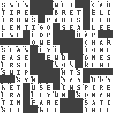 ACROSS 1. Fast planes 5. Remaining after all deductions 8. 4-wheeled motor vehicle 11. Become fatigued 12. Cy Young winner Saberhagen 14. Connecticut Ivy Leaguer 15. Metal shackles 17. Actors' quests 18. Directed 19. Small, flat, pigmented spot on the skin 21. Ocean 22. Area sheltered from the wind 23. Compass dir. 24. Trim (branches) 25. Reproach for some lapse or misdeed 27. Single 28. Burn to charcoal 31. Oceans 35. Sight organ 37. Heavy book 38. Relaxation 39. Conclusion 41. Singles 42. Celtic language 43. Distress signal 45. Monthly bill 46. Clip 47. Mountains (abbr.) 49. Symbol (abbr.) 51. Auto club (abbr.) 52. ___ good deed 55. Soggy 57. Purpose 60. Heighten or intensify 62. Period 63. Film actor Errol 65. Underwater navigation system 66. Metal container 67. Conductor's collection 68. Suttee (variant) 69. Put into a specified state 70. Turn to the right 71. Family _ (genealogy) DOWN 1. Vertical member of a panel or frame 2. Male parents of animals 3. Heavy duty weighing machine 4. Emitted 5. Basketball assoc. 6. Blunders 7. False hair 8. Portable communications device 9. Toward shelter 10. Travel on an animal 13. Russian ruler of old 16. Grain storage tower 17. Wimpy's pal 20. Went 26. Thespian 29. So be it 30. Relief 31. Observes 32. Merit 33. Aide 34. Oozy 36. Followers of ems 40. Realm 44. Comedian Laurel of Laurel & Hardy 48. Backtalk 50. Perform or handle clumsily 52. Middle Eastern gold or silver currency 53. Speak pompously 54. Nest on high 55. Moistens 56. One of the Great Lakes 58. Volcanic refuse 59. Jane of fiction 61. Mail 64. Born