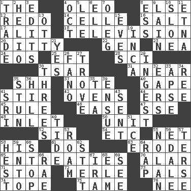 ACROSS 1. Definite Article 4. Butter sub 8. Otherwise 12. Redecorate 14. Cell (Danish) 16. Table seasoning 17. Set down 18. Household entertainment appliance 20. Simple song 22. Commissioned mil. rank 23. Teachers' org. 24. Greek goddess of the dawn 25. Lizard (obsolete) 28. _-fi 30. Russian ruler of old 31. Approach 35. Quiet! 37. Musical sound 40. Yawn 41. Commotion 42. Baking chambers 44. Celtic language 45. Governing power 46. Relaxation 47. Compass dir. 48. An arm off of a larger body of water 50. A single undivided whole 52. Title for a knight 54. And so on (abbr.) 55. Fish or hair follower 58. Part of HMS, perhaps 61. Two (Sp.) 63. Wear away 65. Pleas 70. Having or resembling wings 71. Portico 72. Haggard of country music 73. Friends 74. Drink excessively 75. Docile 76. Born DOWN 1. Exchange 2. Sun: prefix 3. Prepares for publication 4. Sep. follower 5. Area sheltered from the wind 6. Pipe bend 7. Cassini of fashion 8. Double-curved letter 9. (Had) reclined 10. _ gin 11. Inactive volcano in Sicily 13. Baseball player Mel 15. Nights before holidays 19. South American Indian 21. It is so 26. Papal veil 27. Collection of objects 29. Consume 30. Threesomes 32. Hearing organs 33. Domed church section 34. To sift 35. Make senseless or dizzy 36. Land elevation 38. Beverage made from leaves 39. Take place subsequently 41. Indian title of respect (Mr.) 43. Posted 49. Periodic rise and fall of the sea level 51. Frozen water 53. Wander 55. Pitcher Ryan 56. Peak District village in England 57. Laconic 58. Behest 59. To the inside or interior of 60. Obstruct or block passage 62. Proofreading order 64. Hit sharply and swiftly 66. Actress Charlotte 67. Retirement account (abbr.) 68. Shade tree 69. Perceive with the eye