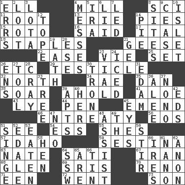 ACROSS 1. Pipe bend 4. Place where flour is made 8. _-fi 11. Carrot, for example 13. One of the Great Lakes 14. Sliced desserts 15. Printing process, for short 16. Stated 17. Slanted text style (abbr.) 18. Paper fasteners 21. Honkers 22. Relaxation 23. Compete 25. Arrange properly for use 26. And so on (abbr.) 29. One of the two male reproductive glands 32. 0 degrees 34. Actress Charlotte 35. One of the 12 tribes of Israel 38. Fly high 39. Hold, grip (Informal) 41. _ vera 43. Potassium hydroxide 44. Writing instrument 45. Make improvements or corrections to 46. Plea 50. Greek goddess of the dawn 51. Observe 54. Double-curved letter 55. "______ My Girl" (Turtles hit) 57. Potato state 59. French poetic form 63. Nathan's nickname 64. Suttee (variant) 67. SW Asia republic 68. Small, secluded valley 69. Indian titles of respect 70. Western Nevada city 71. Car or cant ending 72. Gone 73. Male child DOWN 1. Blunders 2. Spoils 3. Globular water bottle used in Asia 4. Makes clutter 5. Lyricist Gershwin 6. Cards in a Roman deck? 7. Directed 8. Settings 9. Stop 10. Small island 12. Drink excessively 14. Sliced dessert 19. Thin strip of wood or metal 20. Compass dir. 21. Set 23. Small bottle 24. On the rocks 26. Followers of ems 27. Implement 28. Supercomputer manufacturer 30. Heavy duty weighing machine 31. Dutch treat 33. Relationship diagram 36. Toward shelter 37. Words to Nanette 39. Tenement units (abbr.) 40. Possessive pronoun 42. Begley and Asner 45. Snake ____ (dice throw) 47. Modern: prefix 48. Aid 49. Definite Article 51. Burn superficially 52. Peak District village in England 53. Consumed 56. Commotion 58. Layer 60. Angers 61. Billionth: prefix 62. Soon (poet.) 64. Compass dir. 65. "We ___ not amused" (Victoria) 66. Metal container