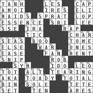 ACROSS 1. Hyperbolic tangent 5. French article 8. Head covering 11. Mine, in Marseilles 12. Angers 14. Biblical high priest 15. Unmarried girls 17. Small fatty European fish 18. Trim (branches) 19. Center 21. _ Lanka 22. Area sheltered from the wind 23. Compass dir. 24. Lyricist Gershwin 25. Hit sharply and swiftly 27. Nervous spasm 28. Burn to charcoal 31. Oceans 35. Sometimes accompanies a hiss 37. Heavy book 38. Otherwise 39. Armed conflict 41. Washington bills 42. Comfort 43. Avid follower 45. Monthly bill 46. Clip 47. Director Reiner 49. Symbol (abbr.) 51. Wedding promise 52. Lion 55. Small child 57. Keyboard modifier key 60. Pulling into pieces 62. Alias (abbr.) 63. Sycophant 65. "_____ Recall" 66. Storage container 67. Flatfish 68. Wig 69. Arrange properly for use 70. "___ Little Indians" 71. Ancient Greek god of war DOWN 1. Domesticates 2. Collect or gather 3. Annoying sound 4. Flintstone garb 5. Mouth edge 6. Blunders 7. Dry up 8. Portable communications device 9. _ vera 10. Corncob 13. Use a spoon 16. In a ____ (agitated or irritated) 17. Manatee 20. Baby bed with high sides 26. Thespian 29. So be it 30. Take ten 31. Perceives with the eye 32. Enthusiasm 33. Aide 34. Not well drained, as in land 36. Clumsy lout 40. Noteworthy scarcity 44. Connecting point 48. Water vessel 50. Floor coverings 52. 61 cubic inches 53. Maternal 54. Stares 55. Bar bills 56. Migrant worker of the '30s 58. Plunder 59. Falsehood 61. Round or rotation of duties 64. Lair