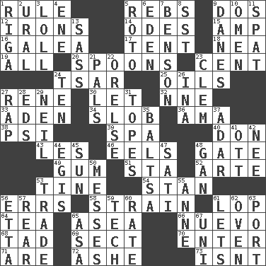 ACROSS 1. General guideline 5. Confederate soldiers (slang) 9. Two (Sp.) 12. Removes the wrinkles 14. Lyric poems 15. Electrical Unit 16. An organ shaped like a helmet 17. Portable shelter 18. Teachers' org. 19. Everything 20. Soup utensils 23. Penny 24. Russian ruler of old 25. Petroleums 27. French philosopher Descartes 30. Allow 32. Compass dir. 33. Arabian gulf 34. Messy guy 36. Nursemaid (var.) 38. Air pressure measure (abbr.) 39. Health resort 40. Spanish title 43. French article 46. Snakelike fish 48. Yard entry 49. Chewing product 51. R.R. building 52. Johnson of "Laugh-In" 53. Prong on a fork 54. Comedian Laurel of Laurel & Hardy 56. Blunders 58. Put through a sieve 61. Chop off 64. Beverage made from leaves 65. Toward the sea 66. New (sp.) 68. Small boy 69. Religious group 70. Keyboard key 71. "We ___ not amused" (Victoria) 72. American tennis player Robert 73. Is not DOWN 1. Capital of Latvia 2. Mountain range 3. Hang loosely or laxly 4. Compass dir. 5. Printing process, for short 6. Paradise 7. Gillaume's butler role 8. Fast jet (abbr.) 9. Natives or inhabitants of Denmark 10. Sign of things to come 11. Argument over a trivial matter 13. Backtalk 21. Friends 22. Threatening words 23. Clement's nick name 24. Nine, plus one 26. _ tizzy (2 wds.) 27. Hit sharply and swiftly 28. Begley and Asner 29. Famous astronaut Armstrong 31. Drinks excessively 35. Greek mezzo-soprano Agnes 37. The sixth month of the Jewish calendar 41. Baseball player Mel 42. Born 44. Armor plate that protects the chest 45. Player for Phoenix 47. Suttee (variant) 48. Separate the seeds from cotton 50. Makes clutter 53. Barter 55. Queen of England 1702-14 56. Singer James 57. Located in or toward the back 59. Technical 60. Assign a rank or rating to 61. Allows 62. Baking chamber 63. Sweet dark-red dessert wine 65. White ___ sheet 67. Single; one (prefix)