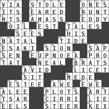 ACROSS 1. By way of 4. Fur scarf 9. Washington bills 13. ___ a Wonderful Life 14. Having ears or earlike features 15. The smallest animal of a litter 16. Mountains (abbr.) 17. Collect or gather 18. Whirlpool 19. Lubricate 21. Eastern Standard Time (abbr.) 22. Falsehoods 24. Perceives with the eye 26. Part of HMS, perhaps 27. Relating to or accompanying birth 29. Periodic rise and fall of the sea level 30. 1973 Nobel Price Winner (Physics) Leo 31. The Jewish people; Israel 33. Plant excrement 36. Elected rep. 37. Normal relaxed breathing 40. Adept person 41. Make lace 42. Actress Patricia 43. Naughty children 45. Enthusiastic 47. It is permitted: Lat. 48. Be seated 49. Ancient Persian 50. First name in cosmetics 52. Deep reverence 54. She-sheep 56. Toward shelter 57. Graphs 59. Tate display 61. Russian ruler of old 62. High-altitude cloud 63. Untruth 64. Snakelike fish 65. Bull 66. Dry husk or covering DOWN 1. Zeal 2. "Tell ____ the Marines!" 3. Helper 4. Ocean 5. Domesticates 6. Mouths or openings 7. For fear that 8. Begley and Asner 9. Threatening words 10. Naked 11. Conclusions 12. Filthy place 20. Path through which fluid escapes 22. One or ones belonging to thee 23. Help 25. Writer Wiesel 27. Egg locale 28. At sea 29. Instrument 31. Broke a traffic law 32. _ tizzy (2 wds.) 33. High altitude stroll 34. Johnson of "Laugh-In" 35. Mail 38. Join together 39. Competent 44. Travel on an animal 45. Michaelmas daisies 46. Compete 49. Distance measurement (Brit.) 50. Otherwise 51. Lick closed 52. Came down and settled, as after flight 53. Had on 55. 4th largest of the Great Lakes 56. Had dinner 57. Personal Computers (abbr.) 58. Title for a knight 60. John Ritter's dad