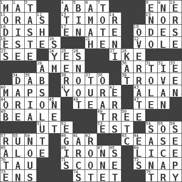 ACROSS 1. Floor protector 4. Blind as ____ 8. Compass dir. 11. Mouths or openings 13. The easternmost of the Lesser Sundas 15. And not 16. Food container 17. Related on the mother's side 18. Lyric poems 19. _____ Park, CO 21. Layer 22. Grand slam 23. Perceive with the eye 24. It is so 27. Mamie's husband 29. So be it 30. Nick name for Arthur 34. Pat or tap gently 36. Printing process, for short 39. Collection of objects 40. Atlas contents 41. You are 43. ____ Jay Lerner 44. Greek mythologigal hunter 46. Separate forcefully 47. Nine, plus one 48. Calif. Air Force Base 49. Woody plant 51. Shoshoni 53. Eastern Standard Time (abbr.) 54. Mayday 57. Undersized animal 60. Slender fish 63. Stop 65. _ vera 66. Removes the wrinkles 69. Louse (plural) 70. The 19th letter of the Greek alphabet 71. Biscuitlike quick bread 72. Fastener 73. Followers of ems 74. Proofreading order 75. Attempt to accomplish something DOWN 1. Methods 2. Originate 3. Clothes sense 4. Had dinner 5. Storage container 6. Nanny 7. Lug 8. Inside; within (prefix) 9. Christmas carol 10. Celtic language 12. A female animal or person 14. Painter Guido (1575-1642) 18. Make much ado about nothing 20. Symbol (abbr.) 25. Suggestive of the supernatural 26. Snout, nose 28. Krazy ___ of comics 29. Utter; complete 31. Lacquered or enameled metalware 32. _ the terrible 33. Car or cant ending 34. Have the gumption 35. Capital of Western Samoa 37. Third day of the wk. 38. Declaim 40. Crowd into 42. Blunders 45. Remaining after all deductions 50. And so on (abbr.) 52. The front part of a cuirass 54. Virtuous person 55. Witty Wilde 56. Not well drained, as in land 57. Pace 58. ____ Bator 59. Common sense 61. Curves 62. Carrot, for example 64. Raised railways 67. Compass dir. 68. Put into a specified state