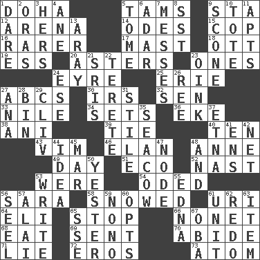 ACROSS 1. Capital of the state of Qatar 5. Scottish caps 9. R.R. building 12. Sports stadium 14. Lyric poems 15. Police officer (slang) 16. Less widely known 17. Vertical spar for supporting sails 18. Baseball player Mel 19. Double-curved letter 20. Michaelmas daisies 23. Washington bills 24. Jane of fiction 25. 4th largest of the Great Lakes 27. Lettered men learn these first 30. Big collection agency 32. Elected rep. 33. "Death on the ____" 34. Puts into a specified state 36. Make supply last 38. Black tropical American cuckoo 39. Standoff 40. Nine, plus one 43. Zeal 46. Style 48. Queen of England 1702-14 49. 24 hours 51. Environmental prefix 52. Political cartoonist Thomas 53. We are 54. Wrote a lyric poem 56. "Two Mules for Sister ____" 58. Overwhelmed 61. RI univ. 64. Connecticut Ivy Leaguer 65. Obstruct or block passage 66. Music written for nine 68. Erode 69. Posted 70. Stay 71. Falsehood 72. Greek god of love 73. Smallest unit of an element DOWN 1. Have the gumption 2. Mouths or openings 3. Possessive pronoun 4. One (Scot) 5. Heavy book 6. The sixth month of the Jewish calendar 7. Makes clutter 8. Fast jet (abbr.) 9. Biscuitlike quick bread 10. Haul 11. Tenement units (abbr.) 13. Like ___ of sunshine 21. Indian titles of respect 22. Cigar-shaped 23. Pig sound 24. Compass dir. 26. To sift 27. Santa ___, CA 28. Storage container 29. 154 in Roman numerals 31. Vertical member of a panel or frame 35. Manatee 37. Inactive volcano in Sicily 41. Followers of ems 42. Remaining after all deductions 44. The main thing one is thinking about 45. Third mo. 47. Thickened enlargement 48. Also 50. Last 53. Compose 55. Pulitzer Prize-winning author Ferber 56. Sew up the eyelids of hawks and falcons 57. Jai ____ 59. Words to Nanette 60. Elects 61. A single undivided whole 62. Redecorate 63. Detail 65. Compass dir. 67. Chief or king in Benin or Nigeria