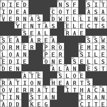 ACROSS 1. Passed on 5. Science/research agcy. 8. Be seated 11. The content of cognition 12. ____ d'Azur (French Riviera) 13. White ___ sheet 14. Actresses Bloom and Felton 17. Residence 19. Gossips 21. Opts 22. Lick closed 23. Actress Charlotte 24. Ocean 27. Length times width 29. Compass dir. 32. Channel Islands abalone 34. Adept person 36. Independent ruler or chieftain 37. Grant temporary use of 38. For each 39. Drop; flow; fall 40. Singer Brickell 41. Single 42. Makes a sale 43. Lair 44. ____ Jay Lerner 46. Eastern Standard Time (abbr.) 47. Had dinner 50. _ gin 52. Food allowance for one day 55. Centers of feelings and intuitions 57. Make much ado about nothing 59. New York city 62. Metal container 63. Comedian Laurel of Laurel & Hardy 64. SW Asia republic 65. Say or write further 66. Barrel 67. Quote DOWN 1. HTML Container Element 2. Binary compound 3. Suggestive of the supernatural 4. Natives or inhabitants of Denmark 5. Immediately 6. Navigate 7. Man or boy (slang) 8. Ketch in the Levant 9. Is not 10. Labels 12. Music discs 15. Approach 16. Play the lead 18. Area sheltered from the wind 20. City in Syria 24. Having a sole or soles 25. Wear away 26. With great haste 28. Sports stadium 29. Grin 30. Beverly of Met fame 31. Take or capture by force 33. Compass dir. 35. Threatening words 36. Compass dir. 42. Derisive sound 45. Mountain range southwest of Kyrgyzstan 47. Wind 48. Cod relative 49. Maternal 51. Principle of right and wrong 52. Round or rotation of duties 53. Enthusiastic 54. Be inclined (to) 55. Layer 56. Indian skirt 58. Label 60. Domesticated feline 61. A saturated hydrocarbon