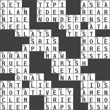 ACROSS 1. Put into a specified state 4. Native american tent (variation) 8. At sea 12. Style 14. Locale of original sin 15. Located in or toward the back 16. The longest river in the world 17. Unrelated to defense, as in spending 20. Stitch closed the eyes of (a falcon) 21. Bear (Spanish) 22. _ moment's notice (2 wds.) 23. Narrow boards 27. Trial 29. Indian titles of respect 31. Undercover agent 34. Bee-related 35. Ancient Greek god of war 36. Northwest Algerian city 39. Opening into something insatiable 41. Fast planes 42. General guideline 43. From or relating to Ireland 46. Actor Lugosi 47. Allows 48. Spoken 51. Brizilian seaport 54. Nonscientific branch of learning 56. Untruth 58. Hats (slang) 61. Producing rotation 66. So be it 67. Clement's nick name 68. 4th largest of the Great Lakes 69. Western Nevada city 70. Ooze 71. Plant excrements 72. Compass dir. DOWN 1. Elected reps. 2. Writer Wiesel 3. Lies 4. Nine, plus one 5. Wedding promise 6. Fenced enclosure 7. _ china 8. "We ___ not amused" (Victoria) 9. Legislators 10. Compass direction 11. Length times width 13. 1994 drama film starring Jodie Foster 18. Eastern Standard Time (abbr.) 19. Enemy 24. Cleo's killer 25. Three (prefix) 26. Thailand, formerly 28. Box-office sellout 30. Slow-paced one 32. Allow 33. Double-curved letter 34. Approach 36. Globe 37. Sorrow 38. One to whom something is allotted 40. Songbird 44. Call ___ day 45. Fast jet (abbr.) 49. The first octave above the treble staff 50. Cards in a Roman deck? 52. Having or resembling wings 53. Citrus fruits 54. Arches 55. Hero or heavy, e.g. 57. Nights before holidays 59. Habitations of wild animals 60. Frozen precipitation 62. Electrical Unit 63. Epoch 64. Mouth edge 65. Affirmative reply