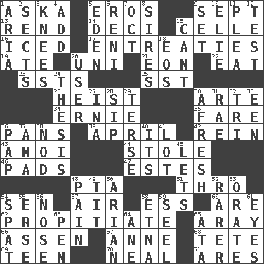 ACROSS 1. "____ silly question..." 5. Greek god of love 9. Back-to-school mo. 13. Tear apart 14. Tenth: prefix 15. Cell (Danish) 16. On the rocks 17. Pleas 19. Had dinner 20. University (slang) 21. Period of immesurable duration 22. Ingest 23. Fast planes 25. Fast jet (abbr.) 26. Robbery 30. Johnson of "Laugh-In" 34. Bert's buddy 35. Conductor's collection 36. Baking dishes 39. Showery time 42. It's straight from the horse's mouth 43. Mine, in Marseilles 44. Fur scarf 46. Groovy apts. 47. _____ Park, CO 48. Parent Teacher Assoc. 51. Through, poetically 54. Elected rep. 57. Wind 58. Curvy letter 60. "We ___ not amused" (Victoria) 62. Appease 65. Like ___ of sunshine 66. NE Netherlands city 67. Singer Murray 68. False hair 69. Adolescent 70. Actress Patricia 71. Ancient Greek god of war DOWN 1. Roberta Peters solo 2. Religious groups 3. Leg joints 4. Find the sum of 5. Genesis locale 6. Painter Guido (1575-1642) 7. Sep. follower 8. Founders of families 9. Arrange properly for use 10. Writer Wiesel 11. Entreaty 12. Trial 15. Patter 18. Greek goddess of the dawn 20. One who uses or employs something 24. College paper 27. _ tizzy (2 wds.) 28. Small drink 29. Laconic 30. Anew 31. Actress Charlotte 32. Three (prefix) 33. Car or cant ending 36. Infant food 37. Wet nurse (var.) 38. Allow head to fall sleepily 40. ___ a Wonderful Life 41. Car dealer's back yard 45. Allows 48. Ache 49. Teat (slang) 50. Believer in; advocate of (suffix) 52. Less widely known 53. Speak pompously 54. Petty quarrel 55. Celtic language 56. Characteristic smell of wine 58. Inactive volcano in Sicily 59. Stitch closed the eyes of (a falcon) 61. Snake ____ (dice throw) 63. Animal enclosure 64. A saturated hydrocarbon 65. _ moment's notice (2 wds.)