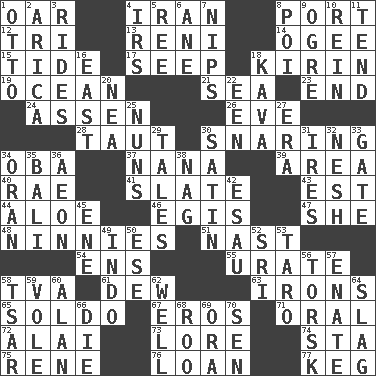 ACROSS 1. Rowing implement 4. SW Asia republic 8. Left side of a ship or aircraft 12. Three (prefix) 13. Painter Guido (1575-1642) 14. Double curve, resembling the letter S 15. Event that recurs at intervals 17. Ooze 18. Japanese brewing company 19. Sea 21. Ocean 23. Conclusion 24. NE Netherlands city 26. Night before a holiday 28. Strained 30. Catching in a trap 34. Chief or king in Benin or Nigeria 37. Grandmother 39. Type of rug 40. Actress Charlotte 41. Chalkboard 43. Eastern Standard Time (abbr.) 44. _ vera 46. The front part of a cuirass 47. A female animal or person 48. Fools 51. Political cartoonist Thomas 54. Followers of ems 55. A salt of uric acid 58. Federal power corp. 61. Morning condensation 63. Metal shackles 65. Twentieth part of a lira 67. Greek god of love 71. Of the mouth 72. Jai _ 73. Old wives' tales, e.g. 74. R.R. building 75. French philosopher Descartes 76. Grant temporary use of 77. Cask DOWN 1. Von Bismarck 2. N. Chile seaport 3. Amusement-park features 4. Big collection agency 5. To separate or throw off 6. A saturated hydrocarbon 7. Cuts off 8. Luau course 9. Legendary monster 10. It's straight from the horse's mouth 11. Look after 16. 90 degrees 18. Polynesian shrub of the pepper family 20. Teachers' org. 22. Car or cant ending 25. Religious women 27. Period 29. Falsehoods 30. Smooth fabric 31. Angers 32. Tender 33. Yard entry 34. Northwest Algerian city 35. Indonesian resort city 36. A really long time 38. Tired old horse 42. Son of Isaac 45. Compass dir. 49. Southeast Asian peninsula 50. Compass dir. 52. Indian title of respect (Mr.) 53. Pacific island yam 56. Cod relative 57. Maternal 58. Russian ruler of old 59. Short-tailed, large-bodied rat 60. ____ Jay Lerner 62. Water source 64. Volcanic refuse 66. Pass on 68. Friend of Pooh 69. Mouth or opening 70. Elected rep.