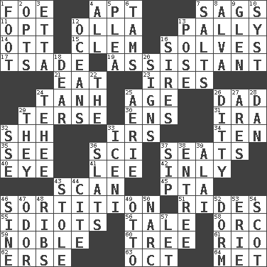 ACROSS 1. Enemy 4. Fitting 7. Sinks 11. Choose 12. Spanish pot 13. Friendly 14. Baseball player Mel 15. Clement's nick name 16. Finds the solution 17. Sadhe (variant) 19. Helper 21. Erode 23. Angers 24. Hyperbolic tangent 25. Ripen 26. June honoree 29. Laconic 30. Followers of ems 31. Retirement account (abbr.) 32. Quiet! 33. Big collection agency 34. "___ Little Indians" 35. Observe 36. _-fi 37. Theater features 40. Sight organ 41. Area sheltered from the wind 42. In an inward manner 43. Examine hastily 45. Parent Teacher Association (abbr.) 46. Drawing lots 51. Amusement-park features 55. Foolish or stupid persons 56. Story 58. The grampus (Milton) 59. Impressive in appearance 60. Family _ (genealogy) 61. River (Sp.) 62. Celtic language 63. Sep. follower 64. Was introduced to DOWN 1. 12 inches 2. Chooses 3. Singer James 4. Everything 5. Entreaty 6. Scottish caps 7. Table seasonings 8. Inventor's middle name 9. Small, secluded valley 10. System (abbr.) 12. Seas 13. Airs 16. Male parents of animals 18. Letter starter 20. Public displays of written messages 22. Definite Article 24. Giggle 25. Nest on high 26. Short, simple song 27. Ancient Greek god of war 28. Daniel's nick name 29. Those people 32. Compass dir. 33. Ancient Celtic tribe of eastern Britain 36. Narrow boards 37. Small drink 38. Main course 39. Jai ____ 43. Took without asking 44. Quote 46. Trig term 47. Aroma 48. Teases 49. "Beetle Bailey" pooch 50. Drug cop 52. Dormintory (informal) 53. 4th largest of the Great Lakes 54. Native of Scotland 57. Allow