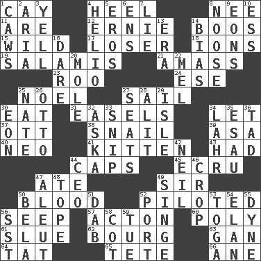 ACROSS 1. Island 4. Person who is morally reprehensible 8. Born 11. "We ___ not amused" (Victoria) 12. Bert's buddy 14. Expressions of contempt or scorn 15. Uncontrolled 17. Failure 18. Charged atoms 19. Deli grouping 21. Collect or gather 23. Friend of Pooh 24. Compass dir. 25. Christmas carol 27. Move on water 30. Ingest 31. Artist's stands 34. Allow 37. Baseball player Mel 38. Slow-paced one 39. White ___ sheet 40. Modern: prefix 41. Baby cat 43. Possessed 44. Smile enhancers 45. Shade of tan 47. Had dinner 49. Title for a knight 50. Vital fluid 52. Manned the helm 56. Ooze 57. 13-14th century defensive garment 60. Much (prefix) 61. Turn sharply 62. French market town 63. Separate the seeds from cotton 64. Make lace 65. Wig 66. One (Scot) DOWN 1. Crow sounds 2. Operatic vocal solo 3. Shout 4. Sun: prefix 5. Greek god of love 6. Followers of ems 7. Falsehood 8. Trap for birds or small mammals 9. Immeasurably long periods of time 10. Curvy letter 13. Period 14. Prejudice 16. Have the gumption 20. Undercover agent 22. Cartoonist voice _ Blanc 25. Nathan's nickname 26. Von Bismarck 27. Theater features 28. Set down 29. Small island 30. Period of immesurable duration 32. "____ silly question..." 33. Clip 34. Cowardly lion portrayer 35. Son of Isaac 36. Small amount or degree 42. Famous astronaut Armstrong 44. Corporate head (abbr.) 46. Riding implement 47. Native American of Southwest Alaska 48. Drink excessively 49. Scorch 50. Actor Lugosi 51. Pat or tap gently 52. Left side of a ship or aircraft 53. Ancient Roman robe 54. Enthusiasm 55. Unit of force 56. Fast jet (abbr.) 58. Small bed 59. Third day of the wk.