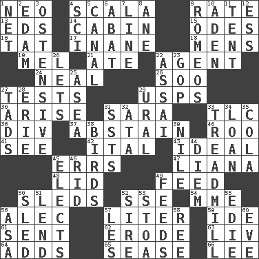 ACROSS 1. Modern: prefix 4. Any of the three canals of the cochlea 9. Assign a rank or rating to 13. Begley and Asner 14. Small house or cottage 15. Lyric poems 16. Make lace 17. Silly 18. Not women's 19. Cartoonist voice _ Blanc 21. Had dinner 22. Rep 24. Actress Patricia 26. "Barney Miller" actor Jack 27. Trials 29. United States Postal Service (abbr.) 30. Originate 31. "Two Mules for Sister ____" 33. Affectionate concern, for short 36. HTML Container Element 37. Refrain by choice 40. Friend of Pooh 41. Observe 42. Slanted text style (abbr.) 43. Perfect 45. Blunders 47. Woody, climbing, usually tropical plant 48. Hat (slang) 49. Nourish 50. Bobsleighs 52. Compass dir. 54. Madame (abbr.) 56. Actor Baldwin 57. 61 cubic inches 59. Binary compound 61. Transmitted 62. Eat (away) 63. 54 in ancient Rome 64. Sums up 65. Gospel singer Marvin 66. Area sheltered from the wind DOWN 1. Fish or hair follower 2. Dutch treat 3. Clearly or manifestly demonstrative 4. _-fi 5. Lessep's creation 6. Blind as ____ 7. Actor's bit 8. One (Scot) 9. Lover boys 10. Arabian gulf 11. Portable shelter 12. Curvy letter 20. Allows 22. Slender Brazilian palm 23. Grand Old Party 25. At sea 27. Small amounts or degrees 28. One of the Great Lakes 29. Mountain range 31. Fast planes 32. _ moment's notice (2 wds.) 33. Excercise machine 34. Grant temporary use of 35. Root beer relative 38. Avian creatures 39. The longest river in the world 44. South Vietnam president (1954) 45. Opts 46. To free from 49. Gives food to 50. Downhill vehicle 51. Grant temporary use of 52. Beget 53. Portico 55. Singer Brickell 56. White ___ sheet 57. French article 58. Portuguese money of account (variant) 60. Night before a holiday