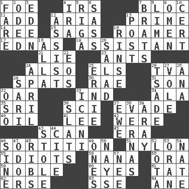 ACROSS 1. Enemy 4. Big collection agency 7. Coalition 11. Find the sum of 12. Operatic vocal solo 13. First class 14. Portuguese money of account (variant) 15. Droops 16. Wanderer 17. Ferber et al. 19. Aide 21. Whopper 23. Pismires 24. In addition 25. Raised railways 26. Federal power corp. 29. Arguments over trivial matters 30. Actress Charlotte 31. Male child 32. Rowing implement 33. Working for oneself (abbr.) 34. Chicken ___ king 35. Indian title of respect (Mr.) 36. _-fi 37. Dodge 40. Petroleum 41. Area sheltered from the wind 42. We are 43. Examine minutely or intensely 45. Epoch 46. Conclusion 51. High-strength synthetic material 55. Foolish or stupid persons 56. Nanny 58. Mouth or opening 59. Impressive in appearance 60. Snake ____ (dice throw) 61. Make lace 62. Celtic language 63. Compass dir. 64. One (Scot) DOWN 1. Conductor's collection 2. Wrote a lyric poem 3. Locale of original sin 4. Lyricist Gershwin 5. Port city in Latvia 6. Backtalk 7. Naughty children 8. Pale green bean 9. Presage 10. An absolute certainty 12. Help 13. Mail 16. Remove soap 18. Silent film actress Nazimova 20. Vegetable dish 22. Greek goddess of the dawn 24. Showery time 25. Bert's buddy 26. Sadhe (variant) 27. Short-tailed, large-bodied rat 28. Santa ___, CA 29. Indian skirt 32. Bear (Spanish) 33. Ancient Celtic tribe of eastern Britain 36. Narrow boards 37. She-sheep 38. Actresses Bloom and Felton 39. Like ___ of sunshine 43. Fur scarf 44. Quote 46. Trig term 47. Scent 48. Chest bones 49. Washington bills 50. Negative votes 52. Globular water bottle used in Asia 53. NW Algerian seaport 54. Nathan's nickname 57. Born