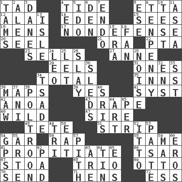 ACROSS 1. Small boy 4. Event that recurs at intervals 8. Singer James 12. Jai _ 14. Paradise 15. Perceives with the eye 16. Not women's 17. Unrelated to defense, as in spending 20. Stitch closed the eyes of (a falcon) 21. Mouth or opening 22. Parent Teacher Association (abbr.) 23. Exchanges for money 27. Singer Murray 29. Snakelike fish 31. Washington bills 34. Add up to 35. Taverns 36. Atlas contents 39. It is so 41. System (abbr.) 42. Small Philippine buffalo 43. Window treatment 46. Rampant 47. The founder of a family 48. False hair 51. Remove all contents or possession from 54. Slender fish 56. Hit sharply and swiftly 58. Not wild 61. Conciliate 66. Russian ruler of old 67. Portico 68. Musical group of three 69. "Beetle Bailey" pooch 70. Transmit 71. Coop moms 72. Curvy letter DOWN 1. Scottish caps 2. Toward shelter 3. Natives or inhabitants of Denmark 4. Nine, plus one 5. Wedding promise 6. Lair 7. Inside; within (prefix) 8. Compass dir. 9. 3-inch nail 10. Trial 11. At sea 13. Small island 18. Period 19. Air blower 24. Lion 25. Allow 26. Kill 28. Annoying sound 30. Bobsleighs 32. Followers of ems 33. Fast jet (abbr.) 34. Sadhe (variant) 36. Informal term for the mouth 37. Cuckoo 38. Coward 40. Indian titles of respect 44. Tate display 45. For each 49. Three (prefix) 50. Consume 52. "Tell ____ the Marines!" 53. Thick mixture 54. Global Positioning Systems (abbr.) 55. Johnson of "Laugh-In" 57. Essential or central part 59. Floor coverings 60. Greek god of love 62. Writing tablet 63. "We ___ not amused" (Victoria) 64. Metal container 65. Greek goddess of the dawn