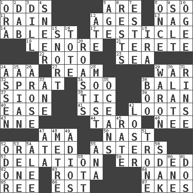 ACROSS 1. Likelihood 5. "We ___ not amused" (Victoria) 8. Bear (Spanish) 11. Water falling in drops from the sky 12. Eras 13. Tired old horse 14. Most capable 17. One of the two male reproductive glands 19. Poe poem 21. Cylindrical with tapered ends 22. Printing process, for short 23. Ocean 24. American Automobile Association (abbr.) 27. 480, 500 or 516 sheets of paper 29. Armed conflict 32. Small fatty European fish 34. "Barney Miller" actor Jack 36. Indonesian resort city 37. The Jewish people; Israel 38. Nervous spasm 39. NW Algerian seaport 40. Comfort 41. Compass dir. 42. Plunders 43. Compass dir. 44. Edible starchy tuberous root 46. Born 47. Nanny (var.) 50. Political cartoonist Thomas 52. Spoke pompously 55. Michaelmas daisies 57. Conveyance 59. Eaten away 62. Single 63. Round or rotation of duties 64. Billionth: prefix 65. Portuguese money of account (variant) 66. Eastern Standard Time (abbr.) 67. Makes supply last DOWN 1. Mouth or opening 2. Small moist lump or mass 3. Deli pickle 4. Scornful expression 5. Ripen 6. Musical pauses 7. First name in cosmetics 8. Single time 9. Table seasoning 10. Double curve, resembling the letter S 12. Had dinner 15. Derisive sound 16. Carry 18. Retirement account (abbr.) 20. Cooks with dry heat, as in an oven 24. NE Netherlands city 25. Bee-related 26. Came up 28. Damp 29. Make _____ (do battle with) 30. Having winglike extensions 31. Remove soap 33. A saturated hydrocarbon 35. Seas 36. Sometimes accompanies a hiss 42. Failure 45. Assign a rank or rating to 47. "One Day ___ Time" 48. Distance measurement (Brit.) 49. Goodbye (Sp.) 51. Heavy duty weighing machine 52. Scent 53. French philosopher Descartes 54. Toward shelter 55. Santa ___, CA 56. Neighbor of Neb. 58. Baseball player Mel 60. Compass dir. 61. Two (Sp.)