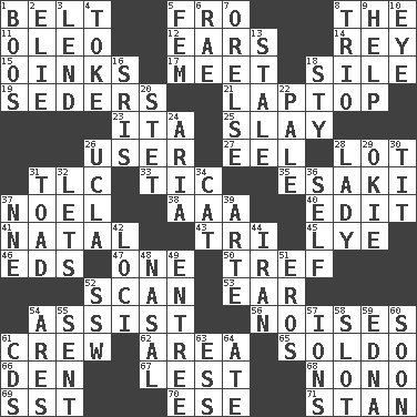 ACROSS 1. Waist strap 5. Back 8. Definite Article 11. Margarine 12. Hearing organs 14. Marina Del _, California 15. Pig sounds 17. Confront 18. Drop; flow; fall 19. Spring feasts 21. Portable computer 23. Call ___ day 25. Kill 26. One who uses or employs something 27. Snakelike fish 28. Car dealer's back yard 31. Affectionate concern, for short 33. Nervous spasm 35. 1973 Nobel Price Winner (Physics) Leo 37. Christmas carol 38. American Automobile Association (abbr.) 40. Prepare for publication 41. Brizilian seaport 43. Three (prefix) 45. Potassium hydroxide 46. Begley and Asner 47. Single 50. Not kosher 52. Examine hastily 53. Ewer handle 54. Aid 56. Annoying sounds 61. Group working together 62. Length times width 65. Twentieth part of a lira 66. Lair 67. For fear that 68. Words to Nanette 69. Fast jet (abbr.) 70. Compass dir. 71. Comedian Laurel of Laurel & Hardy DOWN 1. Expressions of contempt or scorn 2. Writer Wiesel 3. Grant temporary use of 4. Puff or smoke 5. Opposite of masc. 6. Actress Charlotte 7. Threatening words 8. Musical group of three 9. Aid 10. Sight organ 13. Showing deterioration from age 16. Indian titles of respect 18. Filthy place 20. Proofreading order 22. Light colored 24. Operatic vocal solo 26. Southern CA. univ. 28. Kenny Rogers chart-topper in '80 29. Migrant worker of the '30s 30. Teat (slang) 31. Frog relative 32. Allows 34. Feline 36. Itself 37. Compass dir. 39. Johnson of "Laugh-In" 42. Locales 44. SW Asia republic 48. Relating to the nose 49. Main course 51. Greek god of love 52. Compass dir. 54. Ancient Greek god of war 55. Emitted 57. Charged particles 58. Narrow opening 59. Pulitzer Prize-winning author Ferber 60. Within a short period 61. Music discs 63. Double-curved letter 64. Had dinner