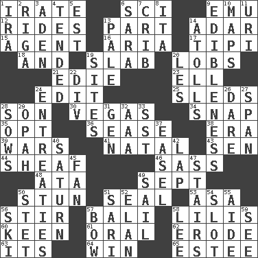 ACROSS 1. Feeling or showing extreme anger 6. _-fi 9. Australian flightless bird 12. Amusement-park features 13. Role in a play 14. The sixth month of the Jewish calendar 15. Representative 16. Roberta Peters solo 17. Native american tent (variation) 18. Also 19. Broad, flat, thick piece 20. Tennis shots 21. Singer Brickell 23. Pipe bend 24. Prepare for publication 25. Bobsleighs 28. Male child 30. Viva Las _ 34. Fastener 35. Elect 36. Gospel singer Marvin 38. Period 39. Armed conflicts 41. Relating to or accompanying birth 43. Elected rep. 44. To gather and bind into a bundle 46. Backtalk 48. "One Day ___ Time" 49. Back-to-school mo. 50. Surprise greatly 51. Lick closed 53. White ___ sheet 56. Use a swizzle stick 57. Indonesian resort city 58. Ms. Damita and namesakes 60. Peachy ____! 61. Of the mouth 62. Eat (away) 63. ___ a Wonderful Life 64. Victory 65. First name in cosmetics DOWN 1. Lyricist Gershwin 2. Port city in Latvia 3. Arabian gulf 4. Watched over 5. Eastern Standard Time (abbr.) 6. "Two Mules for Sister ____" 7. Baby bed with high sides 8. Call ___ day 9. The property of being fit to eat 10. Atlas contents 11. RI univ. 13. Diluted with white 14. Ringlike coral islands and reefs 19. Locates 20. French article 22. HTML Container Element 24. Pleas 26. Have the gumption 27. Connect, as a bridge 28. Sty mamas 29. Brightly colored fish 31. Commissioned mil. rank 32. Auto club (abbr.) 33. Fast jet (abbr.) 37. Artist's stand 40. Titan orbits this 42. Pet locale 45. Avid follower 47. Flight of steps 49. Travel by water 50. Proofreading order 51. Indian skirt 52. Liveliness 54. Notch 55. Assistant 56. What Jean-Claude Killy likes to do 57. Ribbon knot 58. Area sheltered from the wind 59. Perceive with the eye