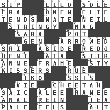 ACROSS 1. Small drink 4. _ and Stitch 8. Not divided or shared with others 12. Epoch 13. Sign of things to come 14. Writer Wiesel 15. Is inclined (to) 18. Nathan's nickname 19. Famous astronaut Armstrong 20. Slender, wiry 22. Tired old horse 23. "Two Mules for Sister ____" 24. Plant holder 25. Commissioned military rank (abbr.) 26. Moved like an arrow 30. Indian title of respect (Mr.) 33. Stay 36. Make new 37. Undesirable depression on a surface 39. "One Day ___ Time" 40. Agitate 41. Singer Murray 42. Movie unit 44. Filthy place 45. Smoochers 47. Regret 50. Ring climax 51. Fast planes 53. Compete 54. Leopard's kin 57. Ketch in the Levant 59. Toward shelter 61. Indian princess (variant) 63. Of or related to the anus 64. It's straight from the horse's mouth 65. Afternoon social gathering 66. Diluted with white 67. Snakelike fish 68. Keyboard modifier key DOWN 1. Arrange properly for use 2. Angers 3. Leg coverings 4. Protracted 5. "If ____ say so..." 6. Allow 7. Single 8. Elected representatives 9. Cassini of fashion 10. Cards in a Roman deck? 11. Snakelike fish 16. To be drawn or hauled along 17. Beget 21. Nanny 22. And not 24. Before (prefix) 26. First man 27. Soaks 28. Prepare for publication 29. Small, narrow, flatbottom fishing boat 30. Neighbor of Neb. 31. Painter Guido (1575-1642) 32. Lodging establishments 34. Oblong pieces of solid material 35. Call ___ day 38. A testis 42. Away 43. Celtic language 46. Make supply last 48. One who makes use of a thing 49. Singer James 52. Before Barbara or Clara 53. Small bottle 54. To provide with a ceiling 55. Coop moms 56. Person who is morally reprehensible 57. Plant excrement 58. Santa ___, CA 59. "We ___ not amused" (Victoria) 60. Area sheltered from the wind 62. Ingest