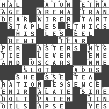 ACROSS 1. Actor Linden 4. Tiny particle 8. Inactive volcano in Sicily 12. Ripen 13. Sports stadium 14. SW Asia republic 15. Letter starter 17. One who wires 18. Small pie 19. Paper fasteners 21. Principles of right and wrong 23. Part of HMS, perhaps 24. French article 26. Snakelike fish 27. Painter Guido (1575-1642) 28. Pull into pieces 30. For each 31. Michaelmas daisies 34. Russian fighter aircraft 37. Make a knot 38. Crowbar 39. Compass dir. 40. Also 41. Motion picture awards 42. Compass dir. 43. Narrow opening 44. Does sums 46. A female animal or person 47. Compass dir. 50. Beverage made from leaves 51. Food allowance for one day 54. Core 57. Arab leader 58. Having winglike extensions 60. Male parent of an animal 62. Dunce 63. Eucharist need 64. Shallow baking pan 65. Petroleums 66. Domed church section 67. Consenting reply DOWN 1. Possessed 2. Ripens 3. Resembling or made to resemble leather 4. Satellite of Uranus 5. Laconic 6. Single 7. Female horse 8. One or the other of two 9. Get behind 10. Drug cop 11. Pismires 13. Leather borer 16. Precipitation 20. Air pressure measure (abbr.) 22. Beverages made from leaves 25. Bull 27. It's straight from the horse's mouth 29. Blunders 30. Parent Teacher Association (abbr.) 31. In addition 32. Religious groups 33. Federal power corp. 34. Ananias' fault 35. Taverns 36. Turn to the right 41. Margarine 43. Chest coverings 44. Had dinner 45. Lairs 46. Free from disturbance or agitation 48. Theater features 49. First name in cosmetics 51. Redecorate 52. Mine, in Marseilles 53. California wine valley 55. Elected rep. 56. One of the Great Lakes 59. Pet locale 61. Followers of ems