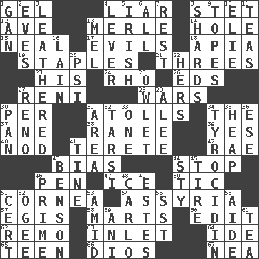 ACROSS 1. Set 4. One who doesn't tell the truth 8. Proofreading order 12. "___ Maria" 13. Haggard of country music 14. Opening into or through something 15. Anneal 17. Vices 18. Capital of Western Samoa 19. Paper fasteners 21. Triplets 23. Part of HMS, perhaps 24. 17th letter of the Greek alphabet 26. Begley and Asner 27. Painter Guido (1575-1642) 28. Armed conflicts 30. For each 31. Ringlike coral islands and reefs 34. Definite Article 37. One (Scot) 38. The wife of a rajah (variant) 39. It is so 40. Dreamland 41. Cigar-shaped 42. Actress Charlotte 43. Prejudice 44. Close up, plug up 46. Writing instrument 47. Frozen water 50. Nervous spasm 51. Pupil covering 54. Nineveh was its capital 57. Armor plate that protects the chest 58. Shops 60. Prepare for publication 62. San ____ (Riviera town) 63. An arm off of a larger body of water 64. Binary compound 65. Adolescent 66. "Vaya con ____" 67. Teachers' org. DOWN 1. Separate the seeds from cotton 2. Nights before holidays 3. Tough but pliablecoriaceous 4. Prying instrument 5. From or relating to Ireland 6. 100% 7. Repose 8. Broken pieces 9. Drinks excessively 10. Writer Wiesel 11. Beverages made from leaves 13. Cartoonist voice _ Blanc 16. (Had) reclined 20. 23rd letter of the Greek alphabet 22. Possessive pronoun 25. A small or young owl 27. Former U.S. Attorney General Janet 29. Toward shelter 30. Baking dish 31. Type of rug 32. Tarsus (plural) 33. Single 34. Polypeptide antibiotic 35. Pile 36. Compass dir. 41. Prong on a fork 43. Gillaume's butler role 44. Filthy place 45. Become fatigued 46. First class 48. Monte _, Las Vegas Hotel/Casino 49. _____ Park, CO 51. Foregone conclusion 52. Double curve, resembling the letter S 53. Among 55. Fast jet (abbr.) 56. Helper 59. Black tropical American cuckoo 61. Afternoon social gathering