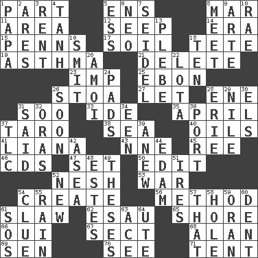 ACROSS 1. Piece 5. Followers of ems 8. Third mo. 11. Type of rug 12. Ooze 14. Period 15. Actor Sean's family 17. Earth 18. False hair 19. Respiratory problem 21. Keyboard key 23. Mischievous child 25. Inky black, to poets 26. Portico 27. Allow 28. Compass dir. 31. "Barney Miller" actor Jack 33. Binary compound 35. Showery time 37. Pacific island yam 38. Ocean 40. Lubricates 41. Climbing, woody, usually tropical vines 43. Compass dir. 45. To sift 46. Music discs 47. Put into a specified state 50. Prepare for publication 52. Delicate 53. Armed conflict 54. Cause to be 56. Mode 61. Cole _ (cabbage dish) 62. Son of Isaac 65. Dinah or Pauly 66. Fr. "Yes" 67. Religious group 68. Actor Alda or Thicke 69. Elected rep. 70. Observe 71. Portable shelter DOWN 1. Dad 2. Ancient Greek god of war 3. Monthly bill 4. Hyperbolic tangent 5. Curvy letter 6. Modern: prefix 7. A glass for beer 8. Confront 9. Johnson of "Laugh-In" 10. Actress Charlotte 13. Military trainee 16. Stricken, poetically 18. "___ Little Indians" 20. Mine, in Marseilles 22. Globular water bottle used in Asia 24. Writing tablets 26. Within a short period 28. 4th largest of the Great Lakes 29. "Death on the ____" 30. Raised railways 31. Alleged 32. Mouths or openings 34. Car or cant ending 36. Left side of a ship or aircraft 37. Affectionate concern, for short 39. Afresh 42. Toward the sea 44. Dutch treat 48. _____ Park, CO 49. College papers 51. Angers 52. ___ Haven, CT 54. A slight indication 55. Precipitation 57. Not this but _ 58. Opening into or through something 59. NW Algerian seaport 60. Gouge 61. Distress signal 63. Adept person 64. Shoshoni